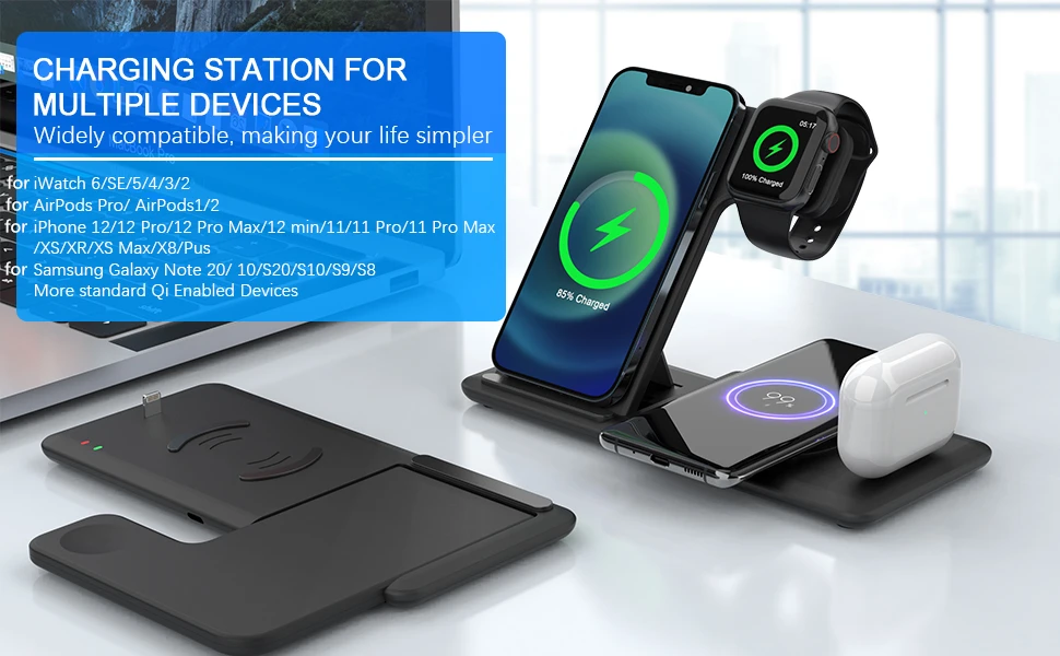 Не требуется сложная установка для зарядки четырех устройств (для Apple Watch, AirPods, iPencil и телефонов). Независимо от того, находится ли он на офисном столе, на прикроватном столике или в гостиной, он очень подходит.