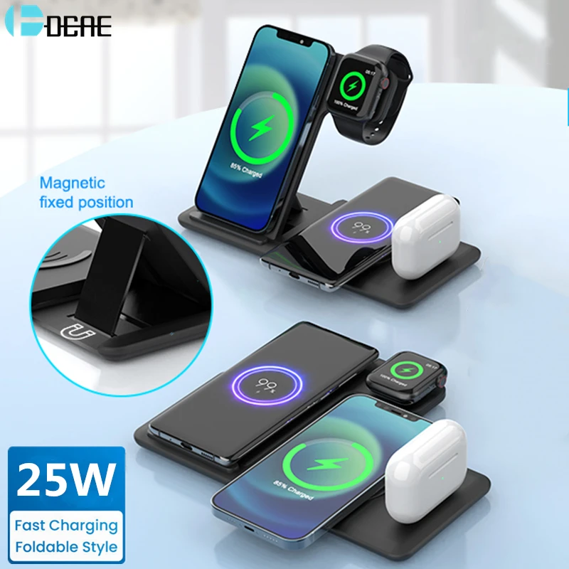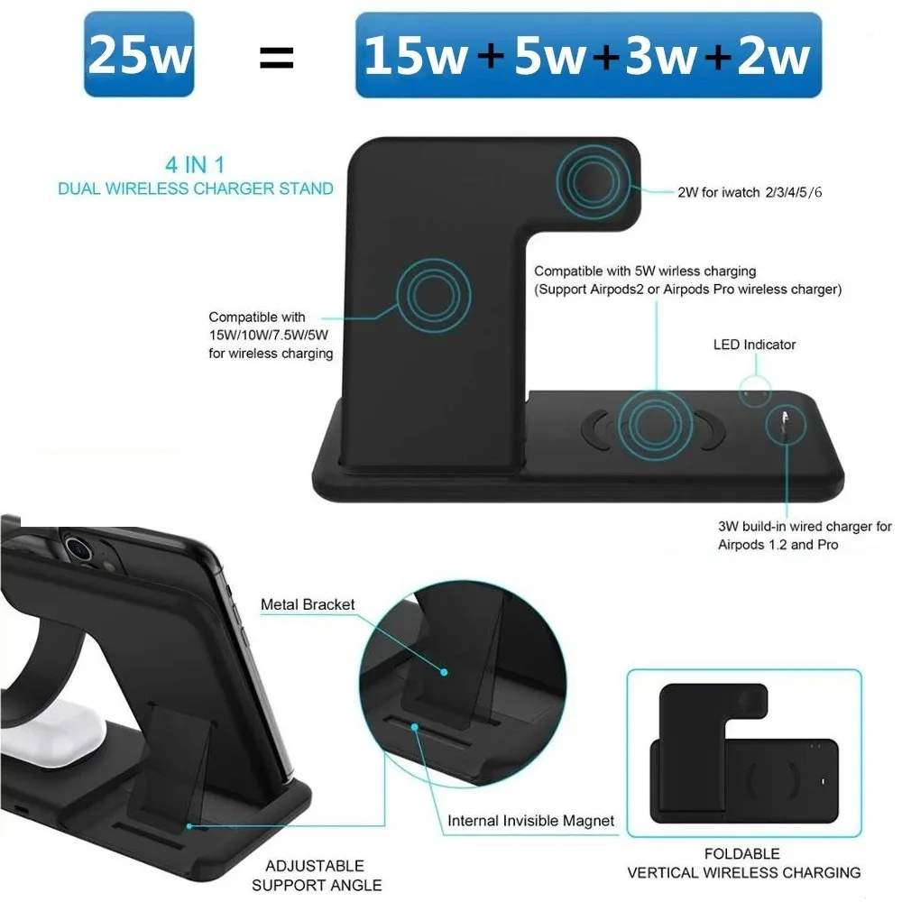 Складное Беспроводное зарядное устройство для iPhone 13 12 11 XS XR X 8 4 в 1 Qi 25 Вт, подставка для быстрой зарядки для Apple Watch 7 6 SE Airpods Pro