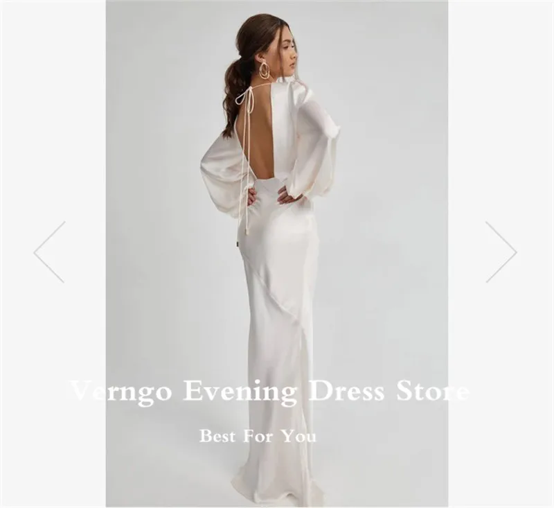 Простое Белое шелковое вечернее платье Verngo с пышными длинными рукавами и V-образным вырезом