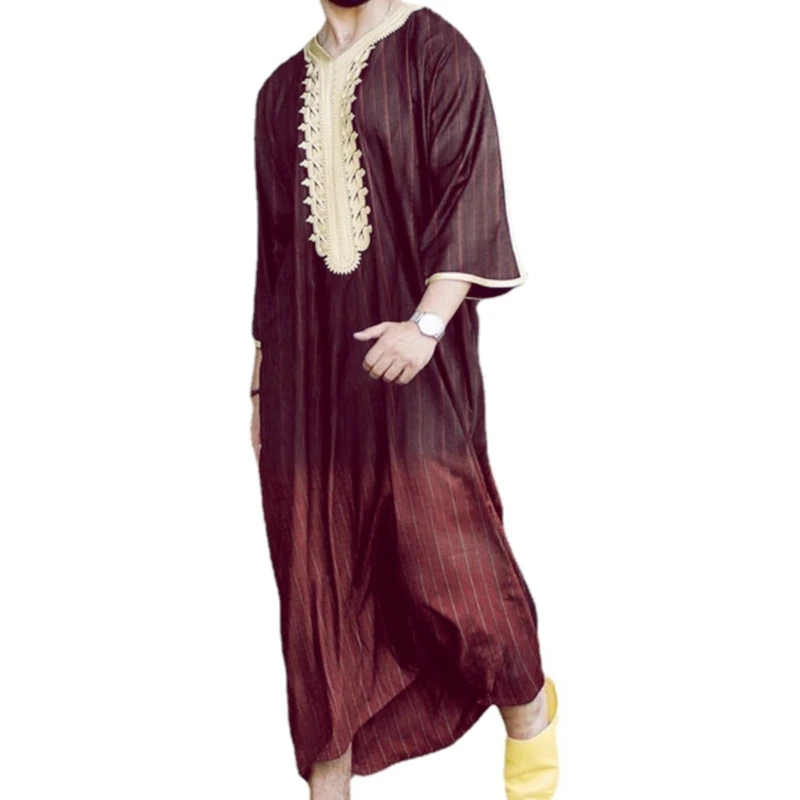 Новинка 2022, мусульманское мужское платье с V-образным вырезом, длинным рукавом, Thobe, Средний Восток, Саудовский, Арабский кафтан, Исламская абайя, Дубайский халат с полосатым узором