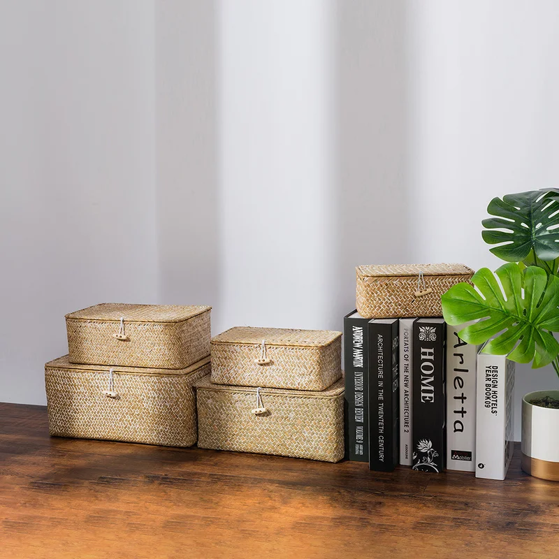Прямоугольный плетеный ящик для хранения с крышкой, ручная работа-тканые корзины, для хранения, Домашний Органайзер для хранения мелочей, коробки для игрушек