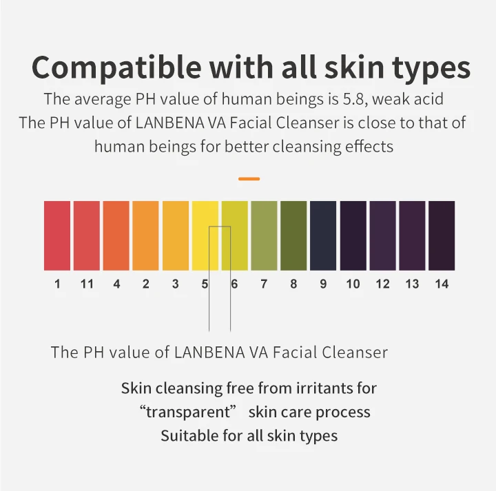 Среднее значение PH у людей составляет 5,8, слабая кислота. Значение PH очищающего средства для лица LANBENA VA близко к значению PH у людей для лучшего очищающего эффектаЗначение PH очищающего средства для лица LANBENA VAОчищение кожи без раздражителей для «прозрачного» процесса ухода за кожей. Подходит для всех типов кожи