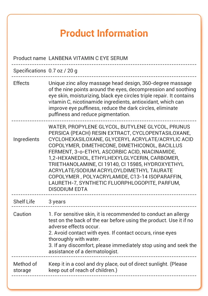 Название продукта: LANBENA витамин CEYE сыворотка Технические характеристики: 20g/0,71 унций эффекты: уникальный цинковый сплав массаж компоновка зон устьевого оборудования, 360 градусов массажа девять очков вокруг глаз, декомпрессии и успокаивает кожу вокруг глаз, увлажняющие, черные круги для глаз тройной ремонт. Содержит витамин С, ингредиенты никотинамида, антиоксидант, который может улучшить отечность глаз, уменьшить темные круги, устранить отечность и уменьшить пигментацию.Состав: вода, пропиленгликоль, бутиленгликоль, PRUNUS PERSICA (персик) экстракт смолы, циклопентасилоксан, циклогексазилоксан, глицерилакрилат/акриловая кислота сополимер ниацинамид, 1,2-гексанодиол, этилгексилглицерин, карбомер, триэтаноламин, CI 19140, CI 15985, гидроксиэтилакрилат/натриевый актилдиметил Таурат сополимер, Полиакриламид, C13-14 изопарафин, LAURETH-7, синтетический флуорфлодопит, парфум, динатрий EDTASkin типы: подходит для различных типов кожи Срок годности: 3 года внимание: для чувствительной кожи, пожалуйста, сначала проверьте его на внутренней стороне руки перед использованием
