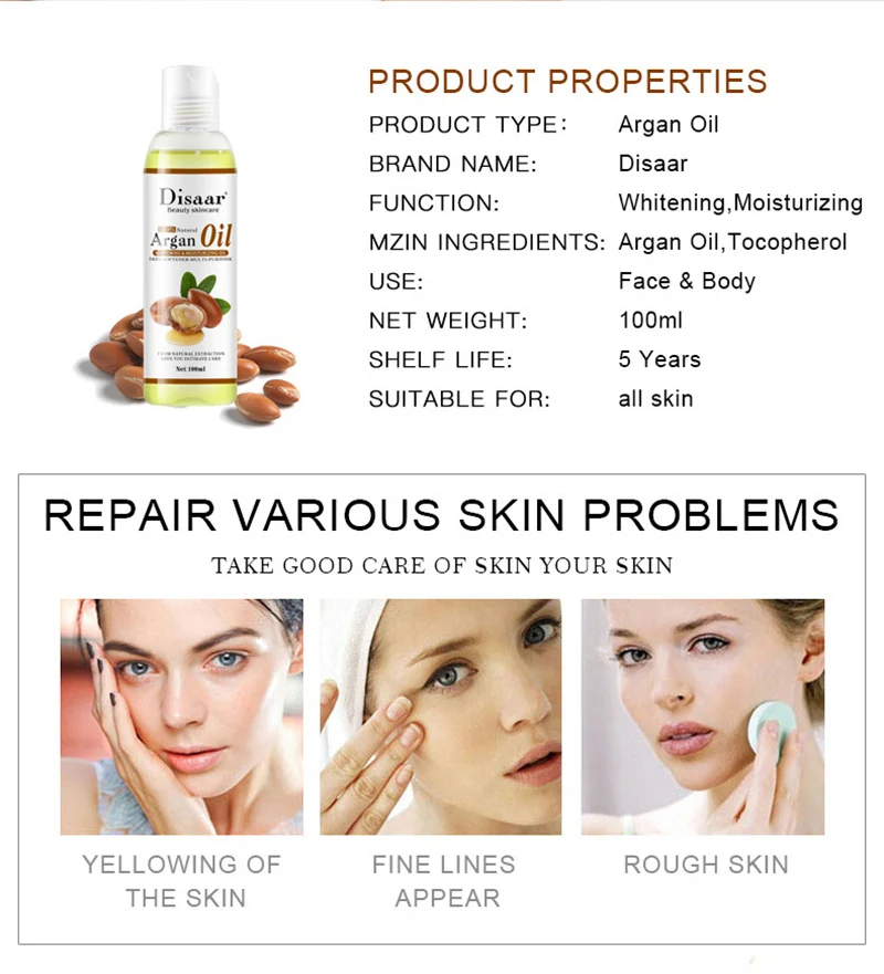 Название продукта: аргановое масло массажное масло для телаВес нетто: 100 млЭффект: продукт богат натуральными экстрактами, которые быстро проникают в кожу, увлажняют, отбеливают, дополняют питание, снимают сухость кожи, разбавляют тонкие линии и пятна, легко впитывается без жирных ощущений и эффективно решает различные проблемы с кожей.