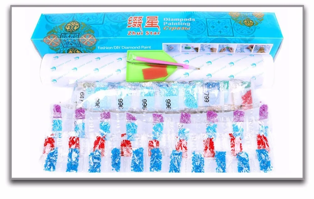 Комплектация: сверло, холст, лоток, точечная Алмазная дрель, клей, бумага формата А4, коробка/бумапосылка.