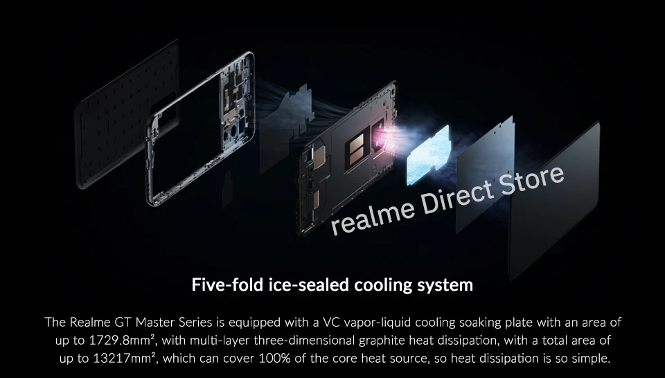 Серия Realme GT Master оснащена vapor-liquid охлаждающей пластиной с площадью до 1729,8 мм, с многослойным трехмерным графитовым рассеиванием тепла, С общей площадью до 13217 мм ², которая может покрыть 100% основной источник тепла, поэтому отведение тепла настолько прост.
