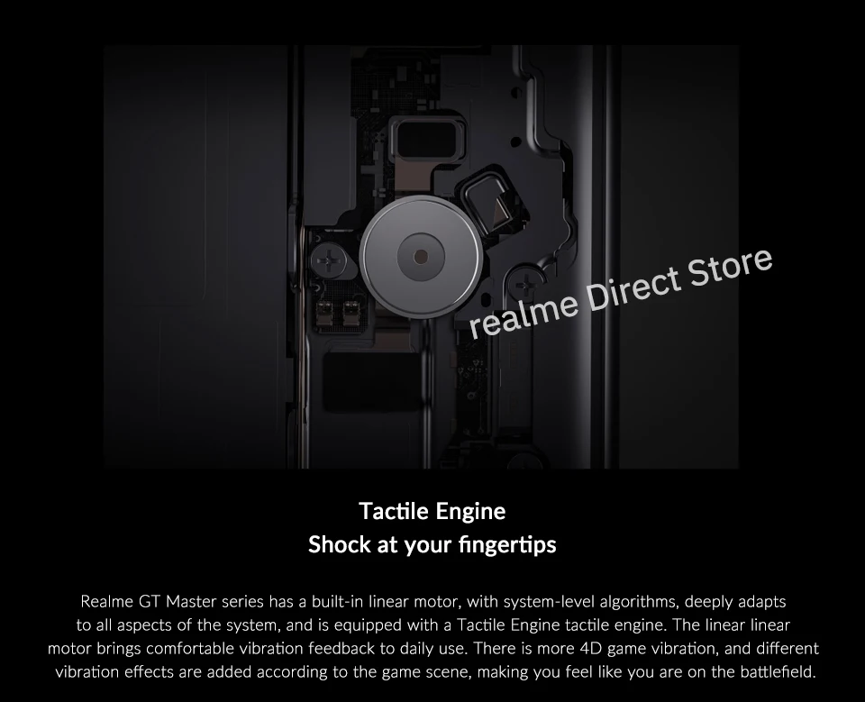 Серия Realme GT Master имеет встроенный линейный двигатель с системными алгоритмами, глубоко адаптируется ко всем элементам системы и оснащен тактильным двигателем. Линейный линейный двигатель обеспечивает комфортные отзывы о вибрации при ежедневном использовании. Существует больше вибрации 4D игры, и различные виброэффекты добавляются в соответствии с игровой сценой, что заставляет вас чувствовать себя как на поле битвы.