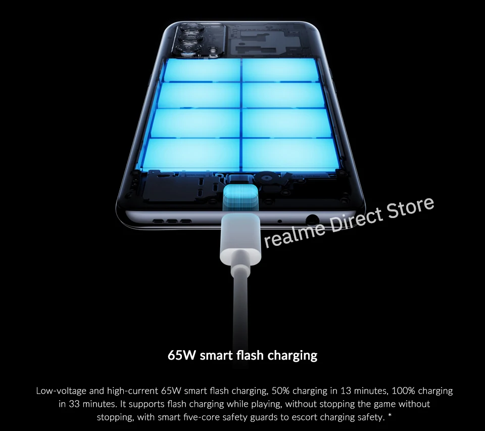 Интеллектуальная вспышка низкого напряжения и высокого тока 65 Вт может заряжать 100% за 33 минуты. Он поддерживает быстрой зарядки во время игры, без остановки игра, не останавливаясь, с smart five-core защитный кожух для сопровождения безопасной зарядки. *