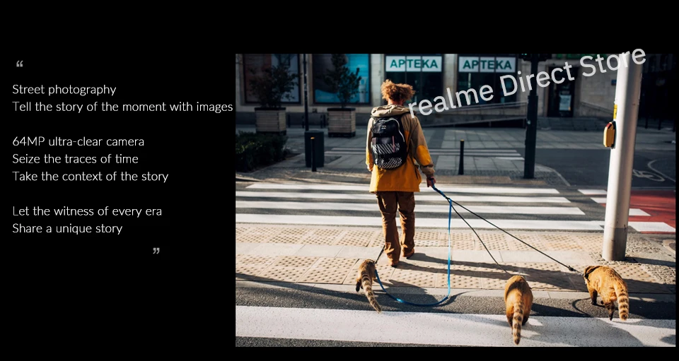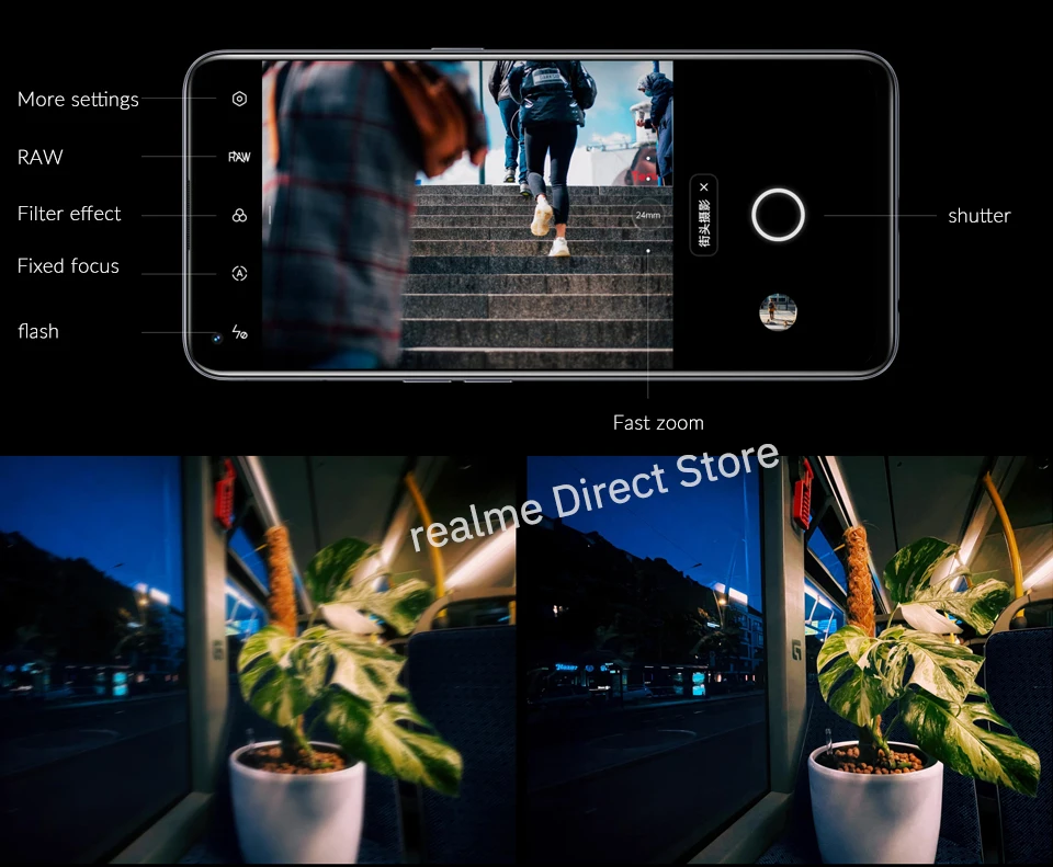 Realme сотрудничал со многими профессиональными уличными фотографами по всему миру, чтобы обсудить, как создавать эмоциональные и сказочные уличные фотографии. Изучив огромное количество уличных фотографий, произведенных по всему миру, были усовершенствованы и основаны на двух характеристиках «fast» и «real», был разработан профессиональный режим уличной фотографии, который может быстро снимать фотографии и ослаблять алгоритм помех.