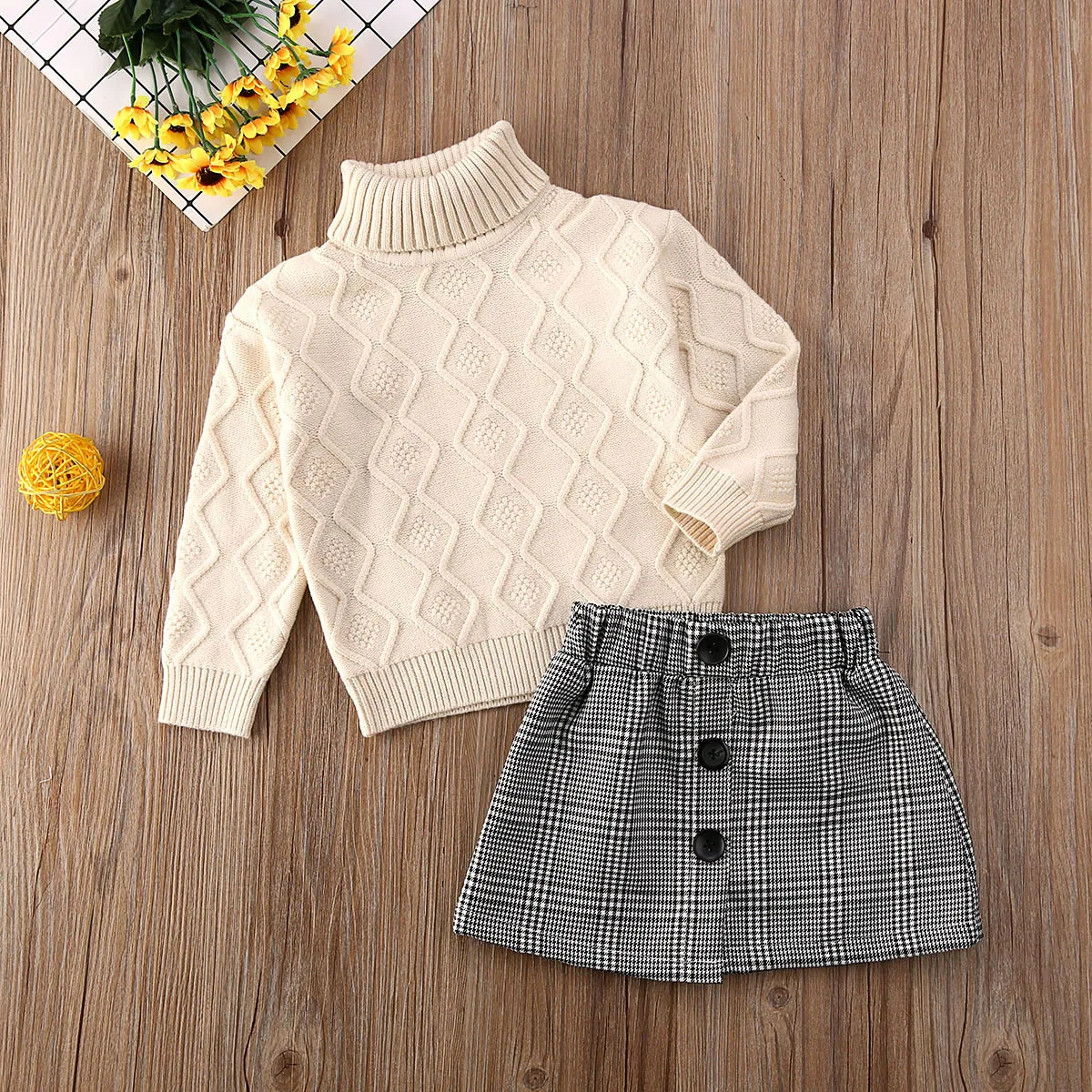 Детская одежда для маленьких девочек; Однотонный вязаный свитер с высоким воротником; Топ + короткая юбка в клетку на пуговицах