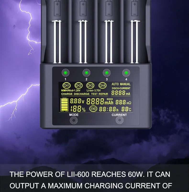 Входное напряжение: 110 В-240 В переменного тока в постоянный ток 12 В/5AВыход напряжение: DC 4,2 V / DC 1,48 VВыходной ток литиевая батарея зарядный ток: (250мА/500мА/1000мА/1500ма/2000ма/3000ма) * 4NiMH аккумулятор зарядный ток: (250мА/500мА/1000мА) * 4Ток разряда: 250мА/500мА/750ма аккумуляторная батарея характеристики: 26650,21700,18650,18350, 20650,14500, AA, AAA и т. Д.Метод прерывания: Интеллектуальный контроль напряженияРазмеры: 165 мм (длина) * 115 мм (ширина) * 40 мм (высота).