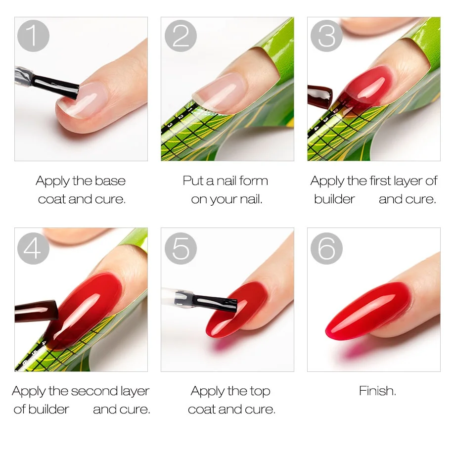 Шаг за шагом: 1. Отожмите гвоздь и удалите кутикулу. 2. Нанесите форму ногтя на ваш ноготь. 3. Нанесите верхнее покрытие и закрепите под светодиодный лампой для 30s или УФ-лампой для 120s. 4. Нанесите один шаг гель для ногтей на кончик ногтей, высушите его под светодиодный лампой для 30s или УФ-лампой для 120s. 5. Нанесите один шаг гель для ногтей на весь гвоздь и Расширьте его до желаемого положения, затем высушите его под светодиодный лампой около 30s или УФ-лампой для 120s. 6. Снимите форму, форму и нанесите удлиненный ноготь. 7. Очистите поверхность ногтя. 8. Нанесите верхнее покрытие и закрепите под светодиодный лампой для 30s или УФ-лампой для 120s. Закончите.