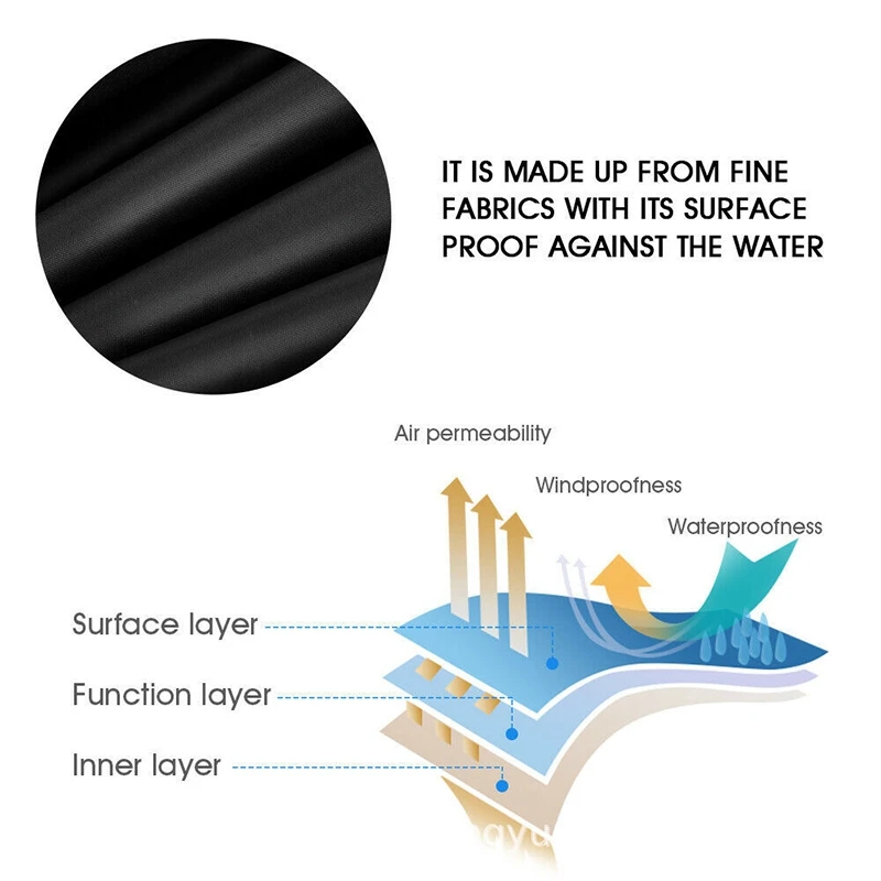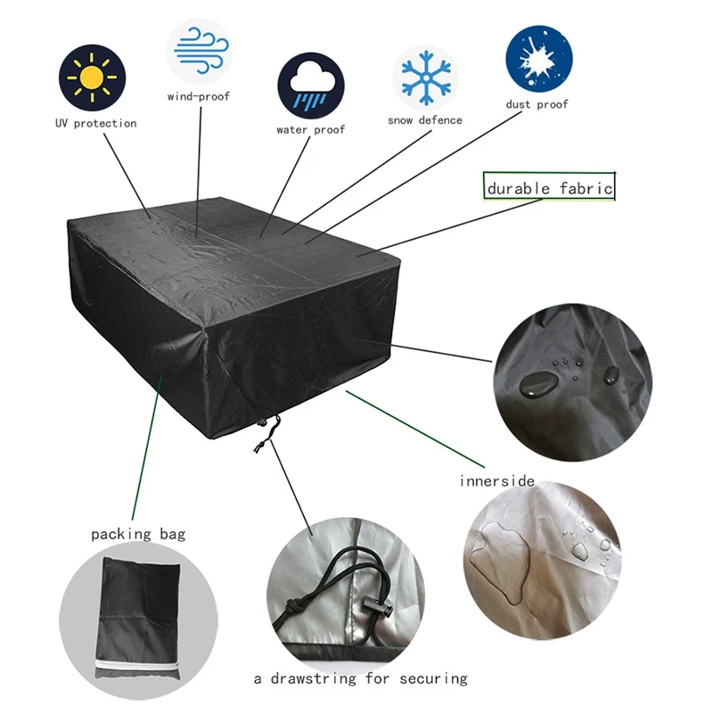 210D полиэстер ткань Оксфорд:1. Высококачественная полиэфирная ткань была протестирована на водонепроницаемость и ультрафиолетовые лучи, и шнурок может быть затянут.2. Полный круг шнурок снизу с проволочным замком для повышения безопасности.3. Предназначен для выдерживания экстремальных температур, Морозов, снега, дождя и ультрафиолетовых лучей.4. Он может предотвратить дождь, снег, пыль и птичьи капли.5. Помогает продлить срок службы садовой мебели.6. Защита окружающей среды и простота в использовании.