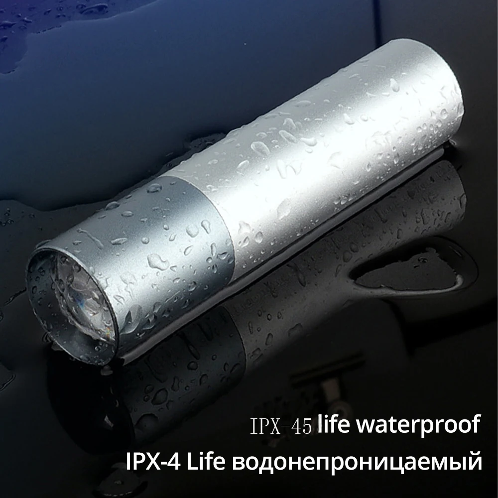 Параметры продукта: Материал: алюминиевый сплав Цвет: серебристый, черный (фиксированный фокус) Режим освещения: сильный светильник, слабысветильник, мигание Функция: освещение, Ночная езда, Аварийная зарядка. Источник питания: Встроенный литиевый аккумулятор 14500 Мини (с защитной платой) Напряжение: 3,7 в Лампы: светодиодный XPE Расстояние съемки: 0-200 метров Водонепроницаемость: Водонепроницаемость IPX45 Яркость: 350 люмен Размер: 90x22 мм Срок службы: 0,8-1 час при сильсветильник щении, 1,6-2 часа при слабосветильник щении Мощность: 5 Вт Особенности:1. Внешний вид продукта имеет простой дизайн, соответствующий современным эстетическим концепциям.2. Изделие изготовлено из высокопрочного алюминиевого сплава, водонепроницаемое, противоударное, ударопрочное и удобное в использовании.3. Мини-модели нельзя использовать в качестве мобильного источника питания. Упаковка:1x задний трос + 1x лампа + 1xusb + 1x пластиковая коробка