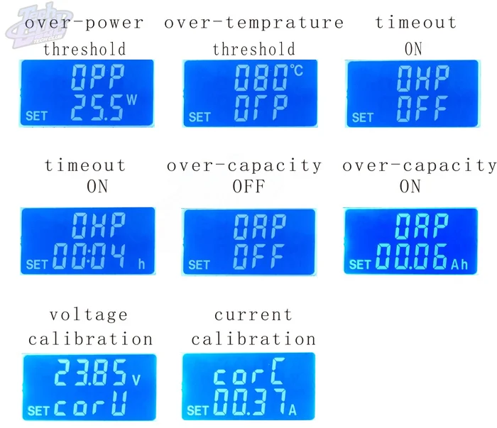 OVP-Защита от перенапряжения (по умолчанию 25,5 V, может быть установить самостоятельно, после того, как защита от перенапряжения, индикатор мигает, ЖК-дисплей интерфейс отображает OVP);