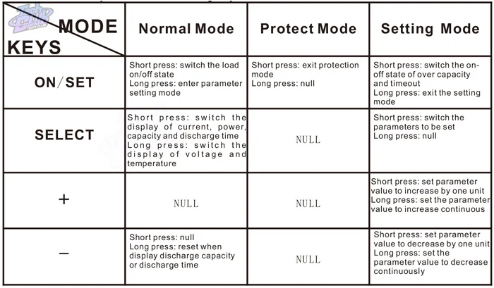В нормальном режиме ЖК-дисплей отображает входное напряжение нагрузки и температуру нагрузки; Ниже по течению отображается ток нагрузки, мощность, емкость и время разряда.