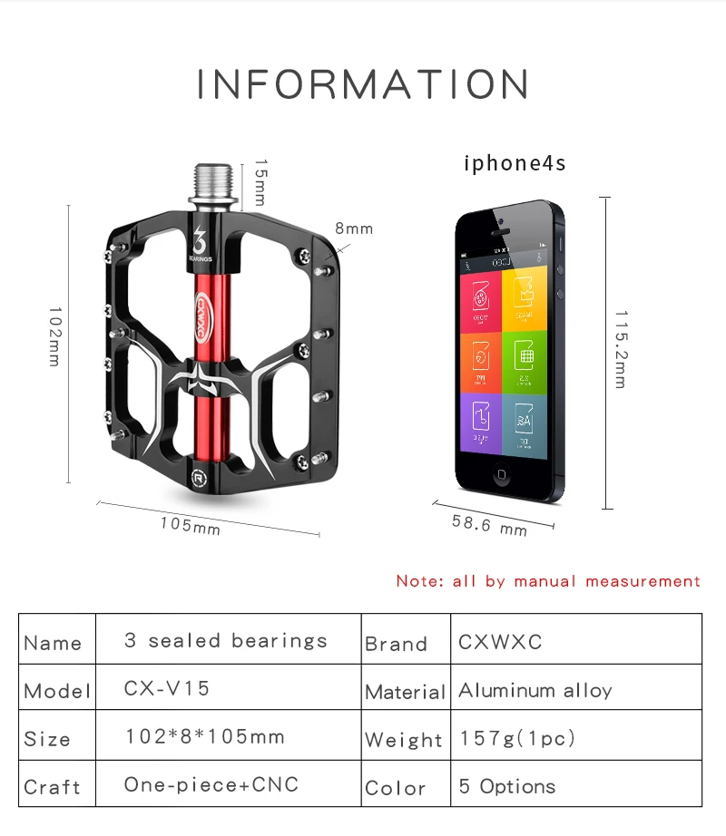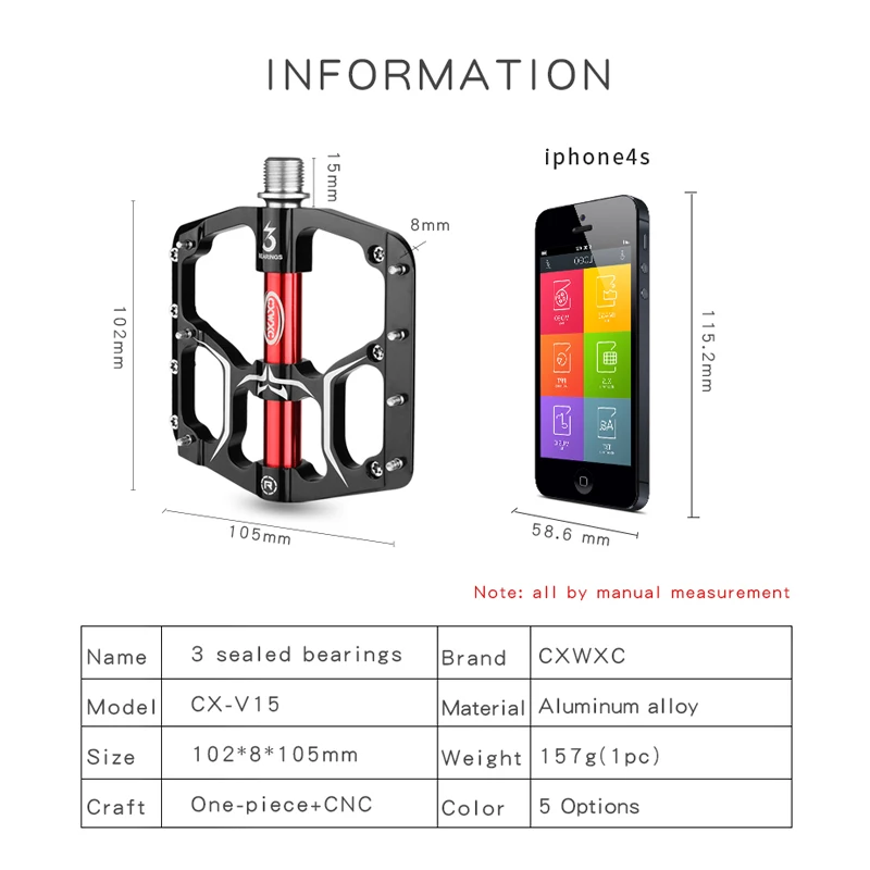 Широкие Плоские Педали для велосипедаИзготовитель: CXWXCПараметры* Модель: CX-V15* Вес: 157 г/шт.* Цвет: черный/красный/золотистый/серебристый/синий* Шпиндель: сталь Cr-mo 9/16 дюйма* Подшипник: 3 герметичных подшипника* Применение: педали для горного велосипеда, дороги, * повседневные, туристические, горные, BMX...【Особенности: 】* Прочный материал с корпусом из алюминиевого сплава и ЧПУ* 3 герметичных подшипника обеспечивают плавную работу педалей14 Противоскользящих штифтов для эффективного педалирования* Широкая платформа proivide лучшие ручки