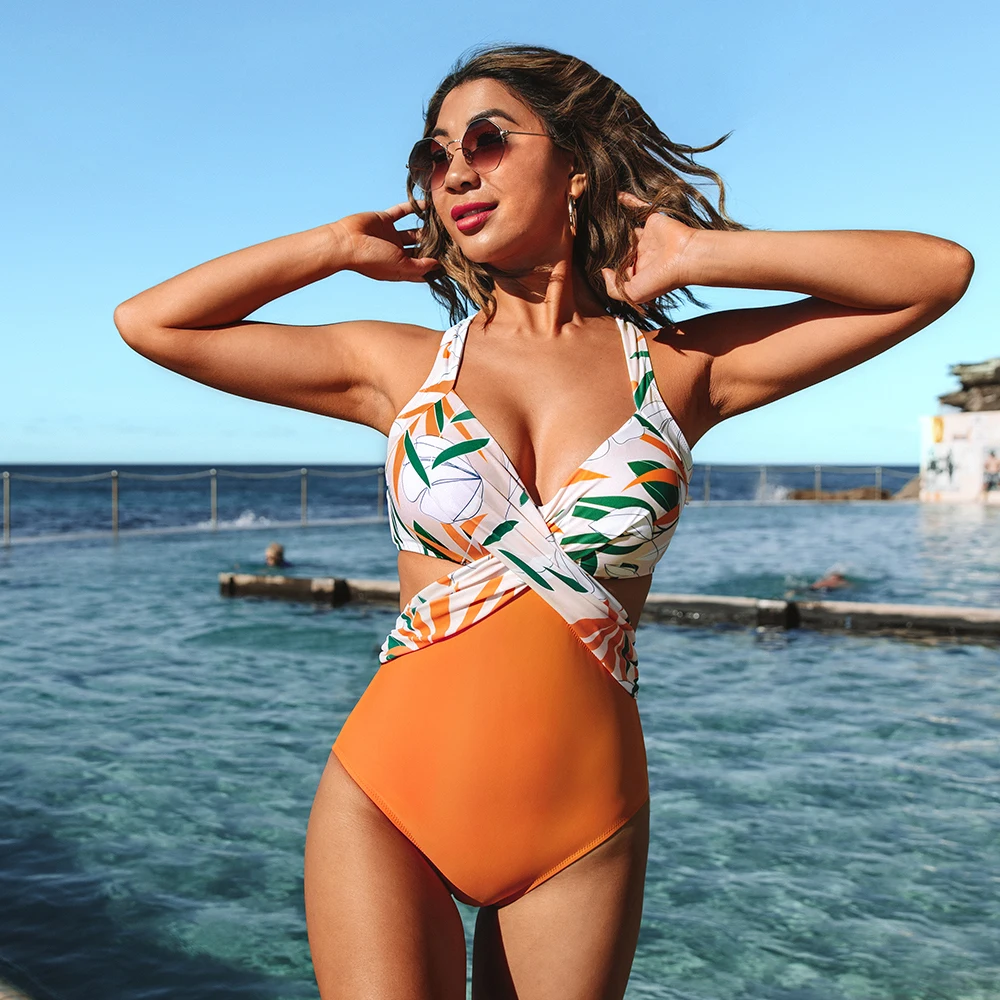 LUNABELLE пуш-ап Оранжевый Цветочный цельный женский купальник сексуальный V-образный вырез на шнуровке купальник монокини Новинка 2021 купальный костюм Пляжная одежда