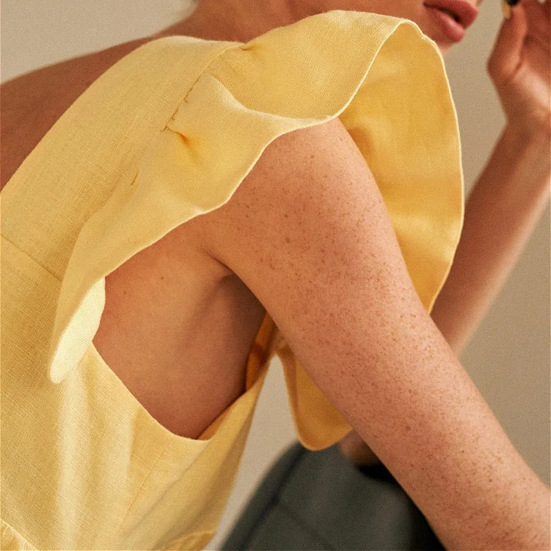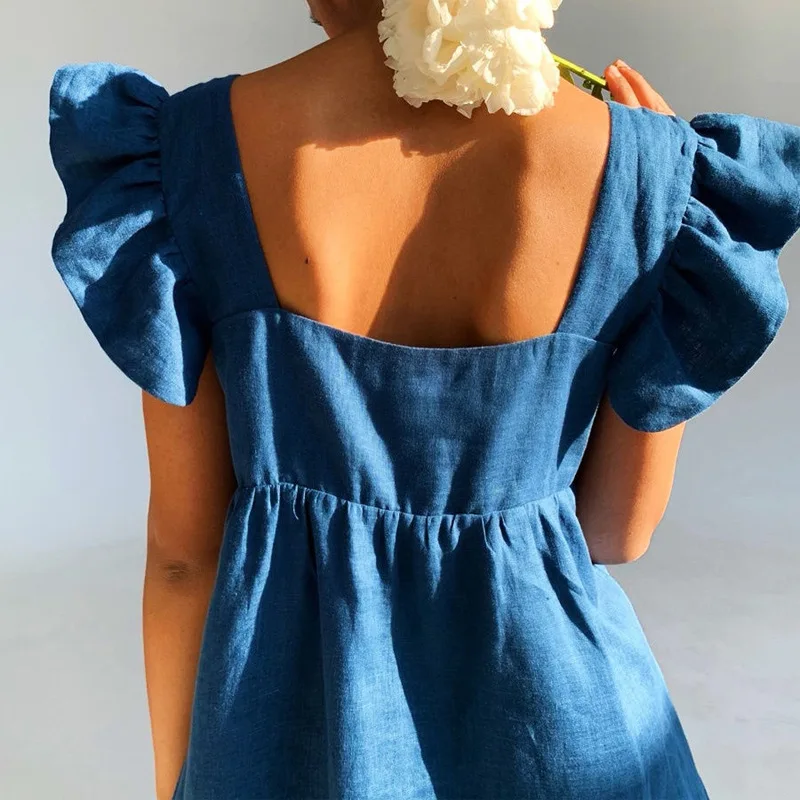 Платье-мини из льна с квадратным вырезом и рукавом-бабочкой, с откр...