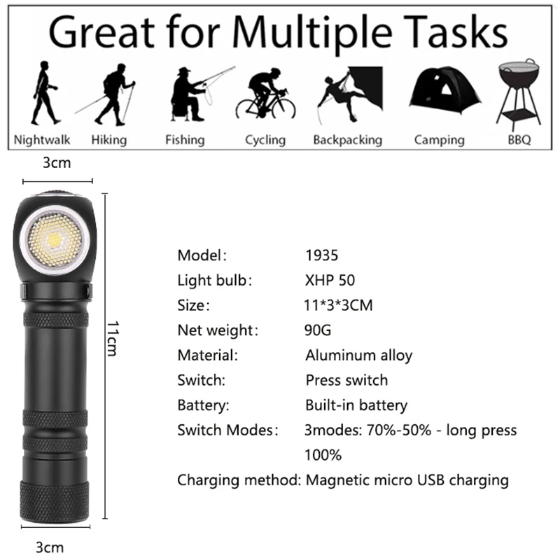 Аксессуары включают: Фонарик + Магнитный usb-кабель + резиновое кольцо + зажим для ручки + кронштейн для фар + ремень для фар XHP50 светодиодный фонарик Специальный держатель лампы Микро-usb для компьютера usb, Автомобильный USB, usb-разъем для зарядки, зарядный фонарик. Изготовлен из авиационного алюминиевого сплава прочный HAIII военный класс Жесткий анодированный. Водонепроницаемый в соответствии с IPX-6, водостойкий, может использоваться в дождливую погоду, но не может положить его в воду. Подходит для работы, охоты, альпинизма, рыбалки, кемпинга и активного отдыха и т. д.Ударопрочный до 2 метров.