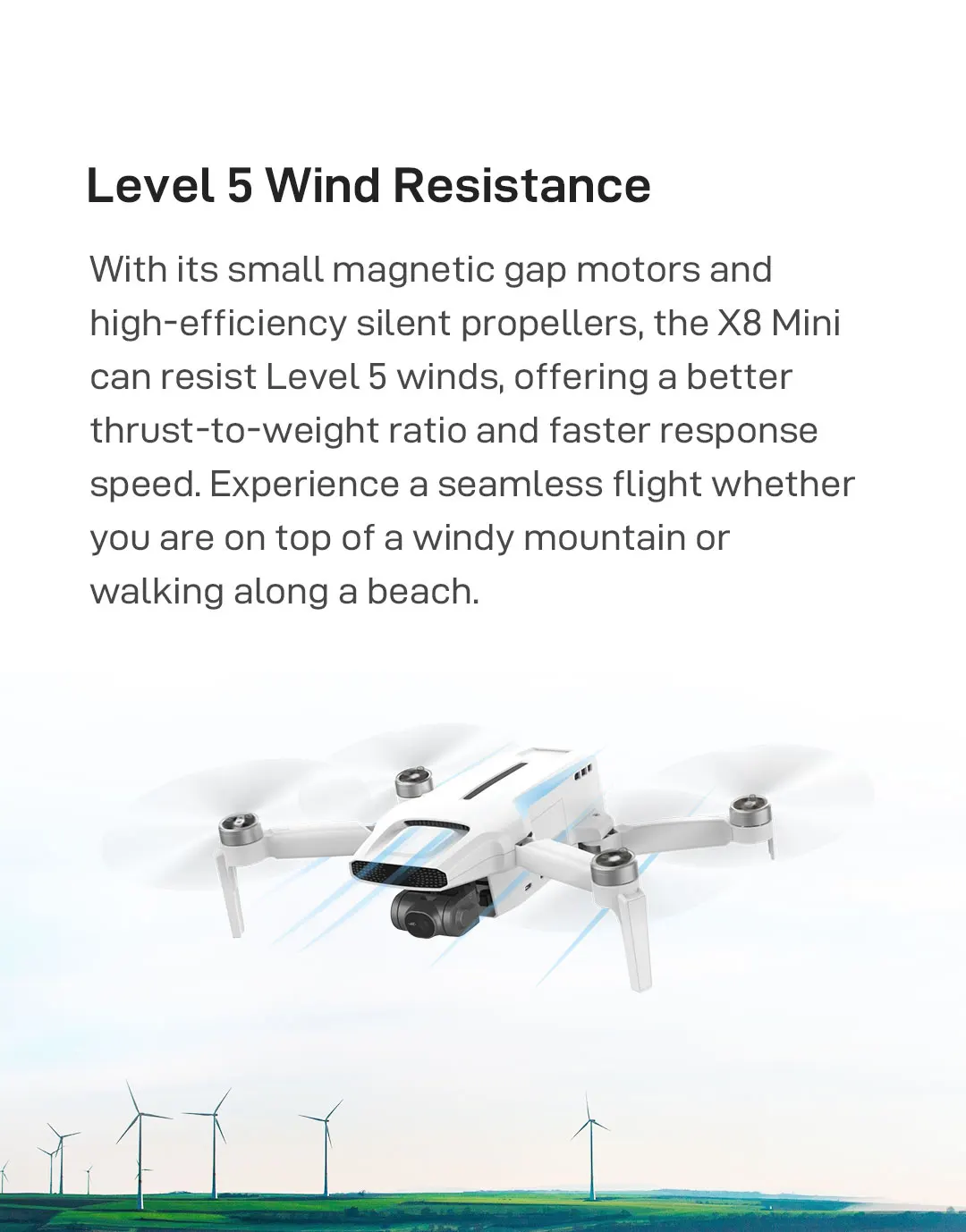 1,250 г-класс сверхлегкий дизайнБлагодаря ультралегкому и складному дизайну класса 250g-, размер ладони FIMI X8 Mini позволяет вам свободно летать, где бы вы ни находились. Используйте несколько режимов съемки, чтобы запечатлеть уникальные моменты с неба!2. Выбор между двумя батареями:Вес дрона со стандартным аккумулятором составляет около 258 г; Вес дрона с Pro аккумулятором-около 245 г3. Дальность передачи 8 км:Обновленная система передачи изображений TDMA обеспечивает стабильную передачу и оптимизированную чувствительность. С дальностью передачи 8 км, пейзаж всегда с вами. Чем дальше вы можете летать, тем дальше вы можете видеть.4. Время полёта 30 минут:Маленький, но мощный, с 30 минутами автономной работы, FIMI X8 Mini позволяет создать блокбастер вашей мечты.* Оснащен стандартным аккумулятором, Дрон может лететь до 30 минут. (В безветренной среде и со скоростью 6 м/с)* Оснащен аккумулятором Pro, Дрон может лететь до 31 минуты. (В безветренной среде и со скоростью 6 м/с)5. Быстрая зарядка аккумулятора типа C:Зарядный порт Type-C на аккумуляторе обеспечивает быструю зарядку 9 В/3 А. Заряжайте резервные батареи без хлопот во время полета дрона.6. Стабилизированный 3-осевой механической Gimbal:FIMI X8 Мини сочетает в себе легкий 3-осевой механической gimbal с новейший профессиональный алгоритм управления для гораздо более высокую точность 0,005 °. Отличная производительность означает стабильную запись!7. 4K HDR видео:Камера оснащена видео 4K/30fps и высокодинамическим диапазоном, что означает более четкую съемку. Видео снимаются в кодеке H.265/HEVC, поддерживаются формат F-log и DNG. Наслаждайтесь профессиональным визуальным опытом, независимо от того, отправляете ли вы видео другу или редактируете свой следующий блокбастер.8. Прямой полет с вашим смартфоном:Дрон может подключаться к вашему мобильный телефон через Wi-Fi даже без пульта дистанционного управления. С высокой пропускной способностью низкой задержкой, и сильный анти-помех 5,8 ГГц высокочастотного сигнала создает до 100 м в режиме реального времени HD передача изображения. Быстро записывайте любой прекрасный момент, который вы не хотите пропустить.9. Уровень 5 сопротивление ветра:С небольшими магнитными зазорами и высокоэффективными бесшумными пропеллерами X8 Mini может противостоять ветрам уровня 5, предлагая лучшее соотношение тяги к весу и более высокую скорость отклика. Испытайте плавный полет независимо от того, находитесь ли вы на вершине ветреной горы или ходите по пляжу. Удобный пульт дистанционного управления-это светильник, который легко носить с собой. Модернизированный приемник позволяет вам наслаждаться стабильной передачей изображений.10. Умные режимы отслеживания:Благодаря технологии AI Дрон всегда может точно зафиксировать цель. Видео в одно касание: одним касанием сделайте кинематографические снимки с помощью FIMI X8 Mini.11. Мощная съёмка плана полета:Мощная функция съемки плана полета предназначена не только для планирования пути, но и для планирования задач.12. Время доставки:X8 Mini с профессиональной системой визуализации и управления полетом позволяет создавать высококачественные и стабильные видео с задержками времени.13. Livestreaming:Поделитесь живыми воздушными видео с друзьями через социальные платформы.14. Панорама:Один кран создает Потрясающие панорамные фотографии.15. Ночная съемка:Работает от профессионал