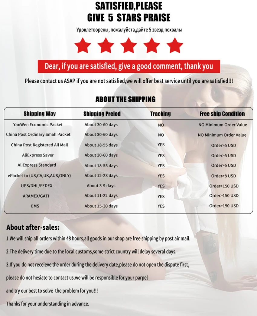 Отзывы:-О техническом обслуживании:Стирать нижнее белье с теплой водой около 30 градусов. Не замачивайте слишком долго. Нижнее белье плотно прилегает и Интимная одежда, которая легко размножает бактерии. Для нашего здоровья рекомендуется заменять его каждые шесть месяцев.-О логистике:Экономика новичков Обычно прибывает в течение 25-75 дней.Простой способ доставки без беспокойства занимает около 25-45 дней.-О транспортировке:После оплаты посылка будет отправлена в течение 48 часов. Если есть недостаток, мы сообщим вам по электронной почте.Проблема цвета:Фактический цвет продукта может отличаться от того, что светильник показан на веб-сайте, что вызвано многими факторами, такими как яркость дисплея, цветовая гамма, насыщенность, И яркость светильник.Напоминание:1: из-за ручного измерения может быть разница в размере 1-2 см.2: Если у вас есть какие-либо вопросы по поводу размера, пожалуйста, свяжитесь со службой поддержки клиентов-Если вы удовлетворены нашими продуктами и услугами, пожалуйста, оставьте свой положительныйОтзывы и 5 звезд.-Если вы не удовлетворены нашей продукцией, пожалуйста, свяжитесь с нами, прежде чем оставить отрицательный отзывы.Мы гарантируем, что мы будем 100% решить любую проблему для вас и сделать вас удовлетворенными.