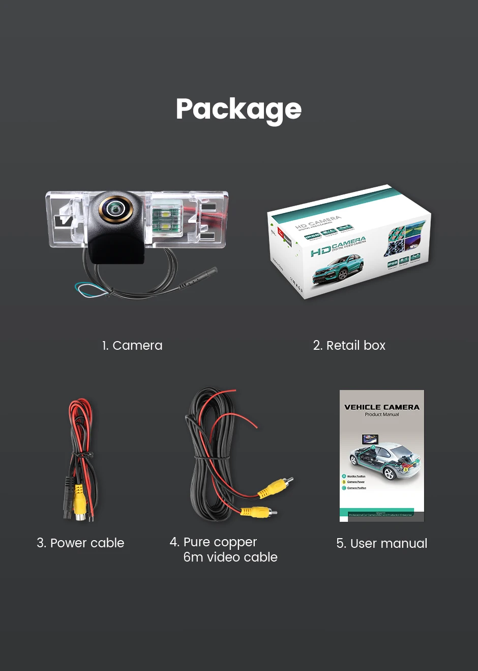 1. Камера заднего вида2. Розничная коробка3. Кабель питания4. Чистый медный 6 м видео кабель5. Руководство пользователя