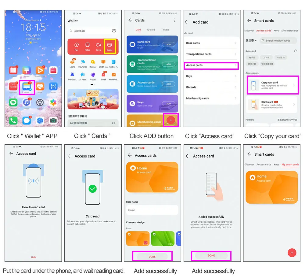 1) Нажмите «кошелек» APP2) Нажмите «карты»3) Нажмите кнопку «Добавить»4) нажмите «Карта доступа»5) нажмите «Копировать вашу карту»6) Положите карту под телефон и дождитесь чтения карты.7) добавить успешно.