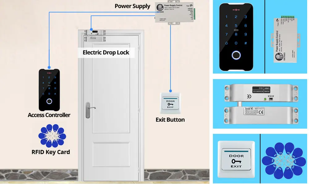 Подходит для дверей из дерева, металла и нержавеющей стали. Нет необходимости в кронштейне.1 * контроллер доступа1 * Электрический замок болта падения1 * источник питания1 * Кнопка выхода двери10 * RFID брелоки1 * Руководство пользователя