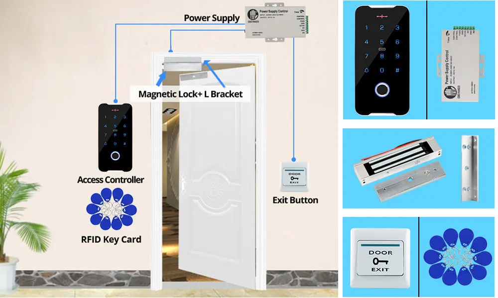 Подходит для деревянной, металлической двери. Нужен кронштейн L.Посмотрите на дверь внутри помещения, если дверь плоская или дверь в дверную раму меньше 3 см, вам нужно добавить L кронштейн.Размер кронштейна L: 170*34*25 мм (Д/Ш/В)1 * контроллер доступа1*180 кг Стандартный магнитный замок1 * L кронштейн1 * источник питания1 * Кнопка выхода двери10 * RFID брелоки1 * Руководство пользователя