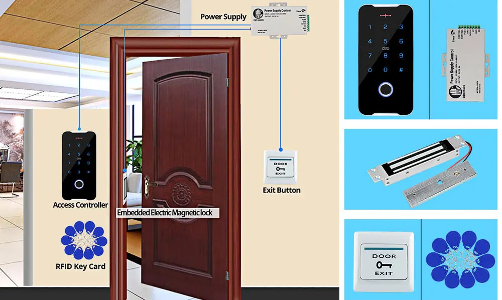 Если у вас уже есть собственный Электрический замок, вы можете выбрать этот kit4.1 * контроллер доступа1 * источник питания1 * Кнопка выхода двери10 * RFID брелоки1 * Руководство пользователя