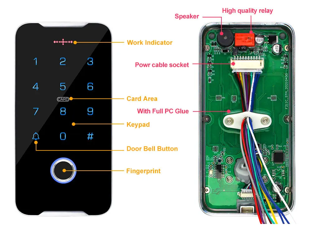 Емкость пользователя: 120Материал: цинковый сплав с акриловой сенсорной панельюКлавиатура: акриловая сенсорная панель с сенсорными клавишамиРабочая частота: 13,56 МГцТип чтения карт: Поддержка карт MF 1K или MF 1K совместимые карты (поддержка IC типа карт)Расстояние считывания карт: 0-5 смМетоды идентификации: отпечаток пальца, RFID карта, пароль, мобильный телефон NFC.Подсветка: с синей подсветкойВодонепроницаемый уровень: IP68 водонепроницаемый, может быть установлен на открытом воздухеКнопка дверного звонка: поддерживает подключение к дверному звонкуWiegand сигнал: WG26 вход/выход (поддержка подключения к кардридеру контроля доступа)Можно установить карту управления: ДаРабочее напряжение: 12 В постоянного токаРабочий ток: ≤ 30 мАВремя открытия двери: 0-99 секунд (может установить время задержки открытия двери.)Рабочая температура: -20 °C ~ 70 °CРабочая влажность: 20% ~ 90%Размер: 139*69*18 мм