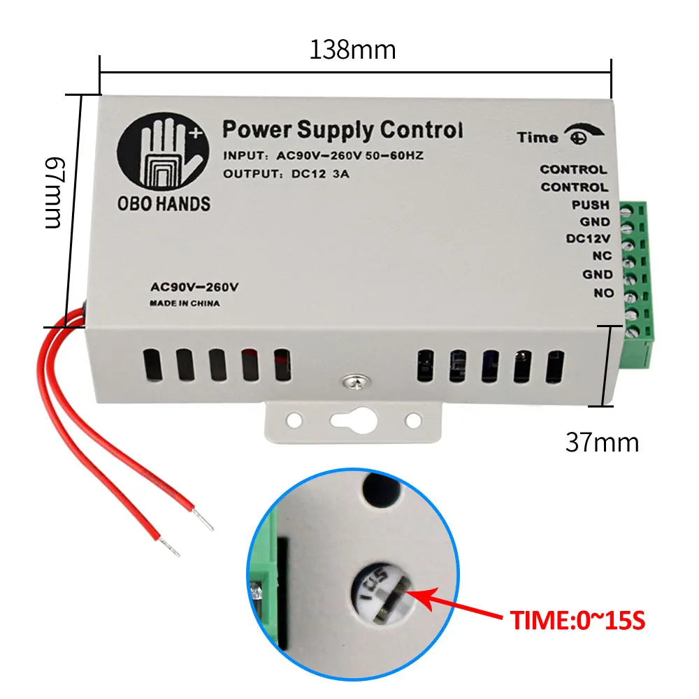 Особенности продукта:1. Этот источник питания DC12V / 3A. Просто подходит только для управления одним замком.2. С управлением, Push, GND, DC12V, NC, без порта, может работать со всеми видами электрических замков.3. С 0-30 секунд Время задержки регулируется.4. Рабочее входное напряжение AC90-260V, больше свободы.5. Меньшее энергопотребление и высокая мощность. Небольшой коммутационный транзистор.Характеристики продукта:Входное напряжение: AC90V-AC260V 50-60 ГцВыходное напряжение: DC12VМгновенный ток: 3AПостоянный ток: 3.5AОперационной Температура: ﹣ 20 ℃ ~ ﹢ 60 ℃Рабочая влажность: ≦ 90%Задержка времени: 0 ~ 30SФункция дистанционного управления: ДаРазмер: 138x67x37мм (Д/Ш/В)