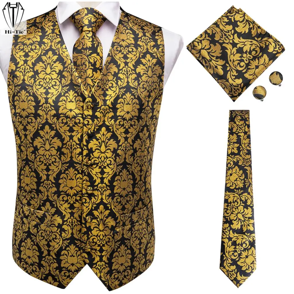 Hi-Tie жаккардовый Шелковый мужской костюм жилетки Золотой однотонн...