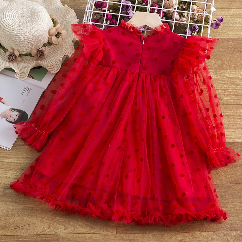 Весенне-осенние платья для девочек, красное платье в горошек с обор...