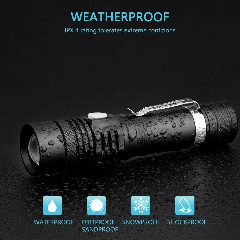Супер яркий фонарик, высокий люмен--- High Lumen светодиодный тактический вспышки светильник L2 T6 супер яркий светодиодный поставляется с высокой светоотдачей, что в 10 раз ярче, чем старый накаливания светильник s; широкий выбор режимов светильник и алюминиевый корпус делают этот Тактический осветительный светильник самым ярким и универсальным в своем классе.USB Перезаряжаемый фонарик, долговечный, защита от перезарядки---Заряжаемый от USB фонарик, требуется всего 3 часа, чтобы получить полную зарядку через любой usb-порт, этот перезаряжаемый фонарик с высоким люменом может достигать до 8 часов (низкий режим) рабочего времени; перезаряжаемый фонарик с батареей 18650, Светильник для вспышки прекратит зарядку при полной зарядке, так что вам не нужно беспокоиться о проблемах безопасности, когда вы забудете, что светильник для вспышки заряжается.Светодиодный масштабируемый фонарик, 4 режима---Мощный перезаряжаемый фонарик, легко вытягивает корпус фонарика, может получить широкое и узкое увеличение луча, что делает этот светодиодный фонарик идеальным для использования вокруг дома, прогулки с собакой или кемпинга. Тактический фонарик с высоким люменом имеет 4 режима: высокий/средний/низкий/Стробоскоп, стробоскоп будет держать вас в безопасности в любой ситуации.Небольшой перезаряжаемый водонепроницаемый фонарик--- IPX6 Водонепроницаемый фонарик, подходит для использования в дождевых, снежных или аварийных ситуациях. Небольшой светодиодный фонарик длиной менее 5 дюймов, обеспечивая высокую производительность, дальность луча до 600 футов, обеспечивает такой же световой поток, как и большие, более длинные фонарики. Этот небольшой мощный фонарик с карманом-зажимом, достаточно компактный, чтобы поместиться в карман, рюкзак или кошелек, не разрывая.