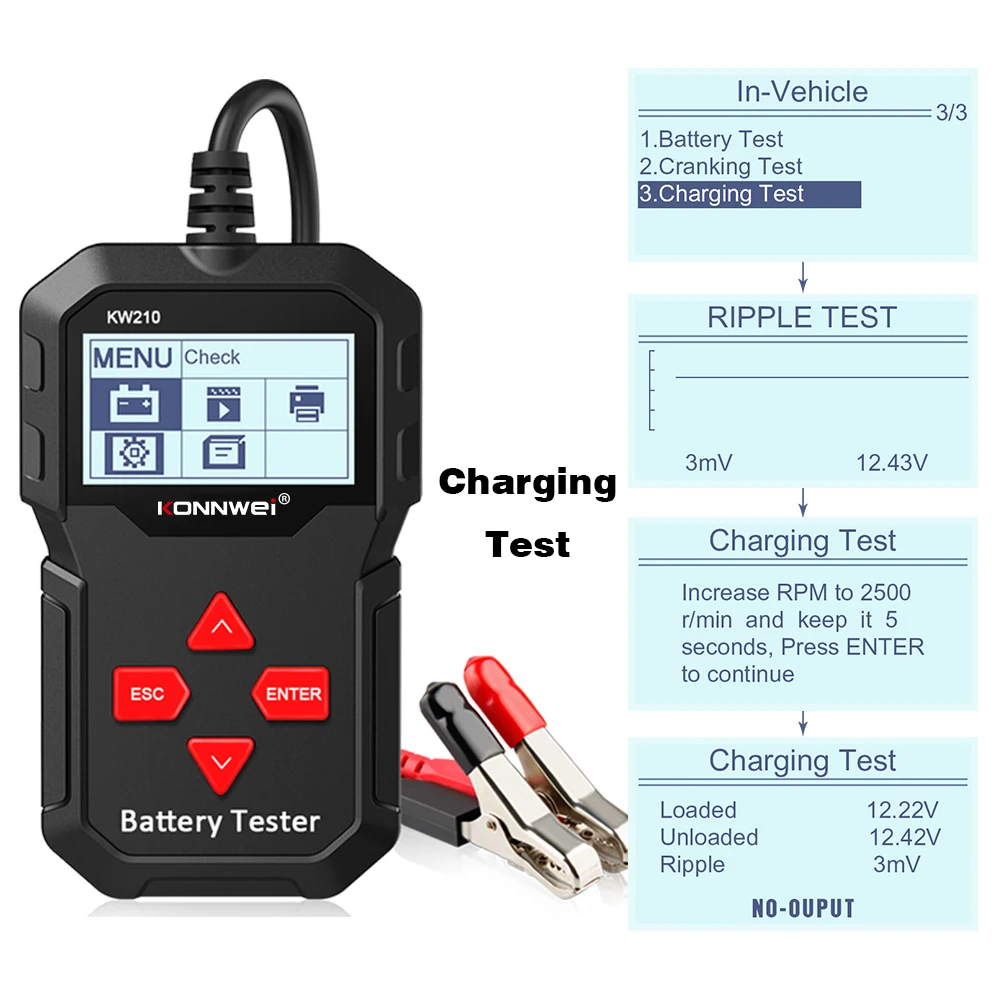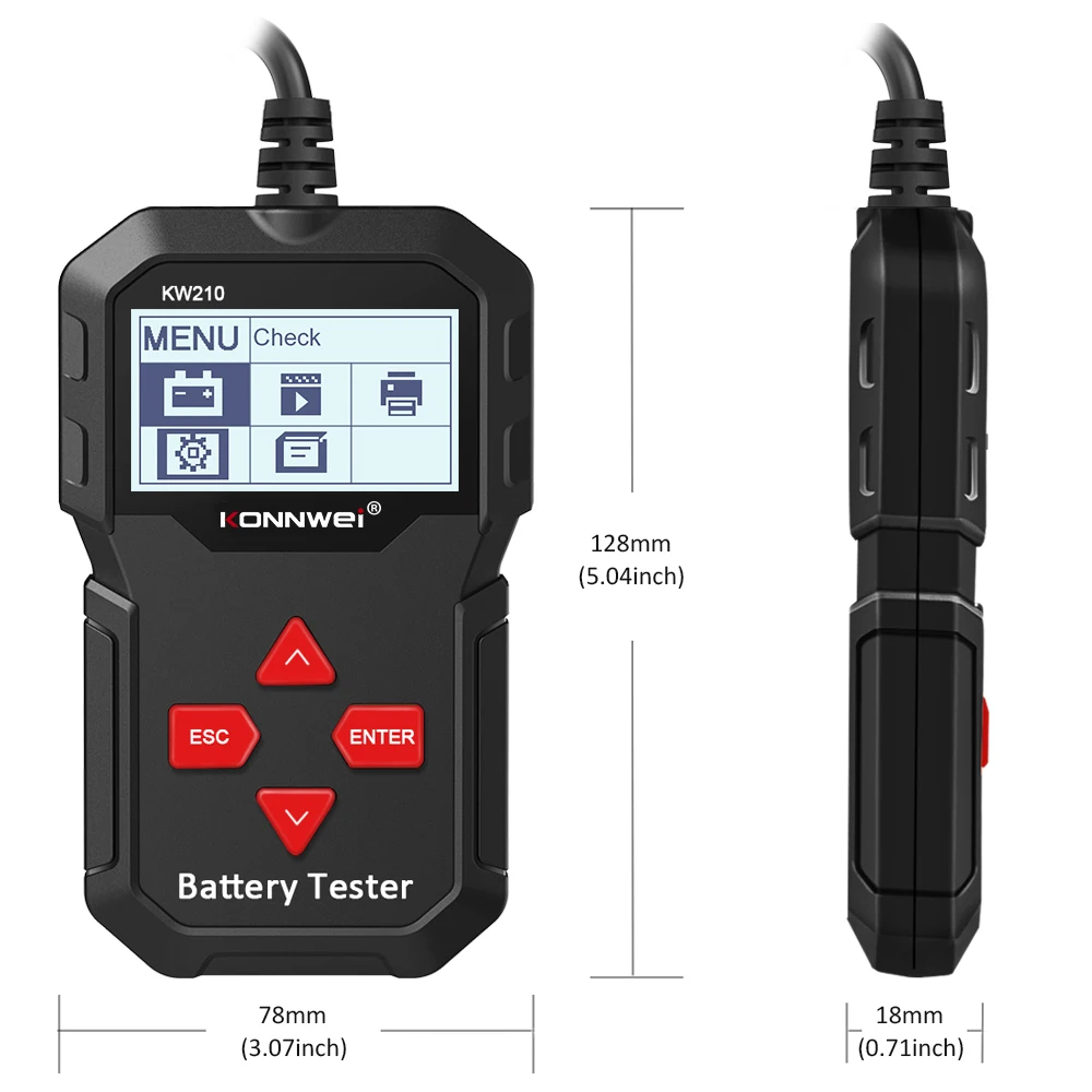 KONNWEI KW210-это новый аккумулятор-тестер, обновленный от старого классического тестера с подсветкой на рынке, направленный на быстрый и точный контроль состояния здоровья батареи, а также проверка рабочего состояния генератора. Это профессиональный диагностический инструмент транспортного средства для проверки проблем с системой батареи с помощью инструмента мониторинга напряжения с графическим изображением, с цветным экраном и уникальным дизайном узора, бесплатным обновлением в течение всего срока службы, KONNWEI KW210-идеальный инструмент для тестирования батареи для вашей работы и семьи.KONNWEI KW210 в Основном предназначен для анализа здорового состояния батареи для расчета фактического холодного сгибания, мощности аккумулятора и степени старения, которые обеспечивают надежные доказательства анализа для тестирования и обслуживания батареи. KW600 уведомляет пользователей, чтобы заменить батарею заранее, когда батарея состарится