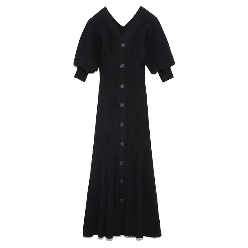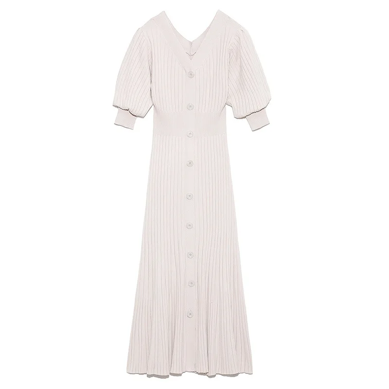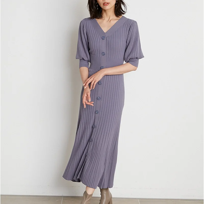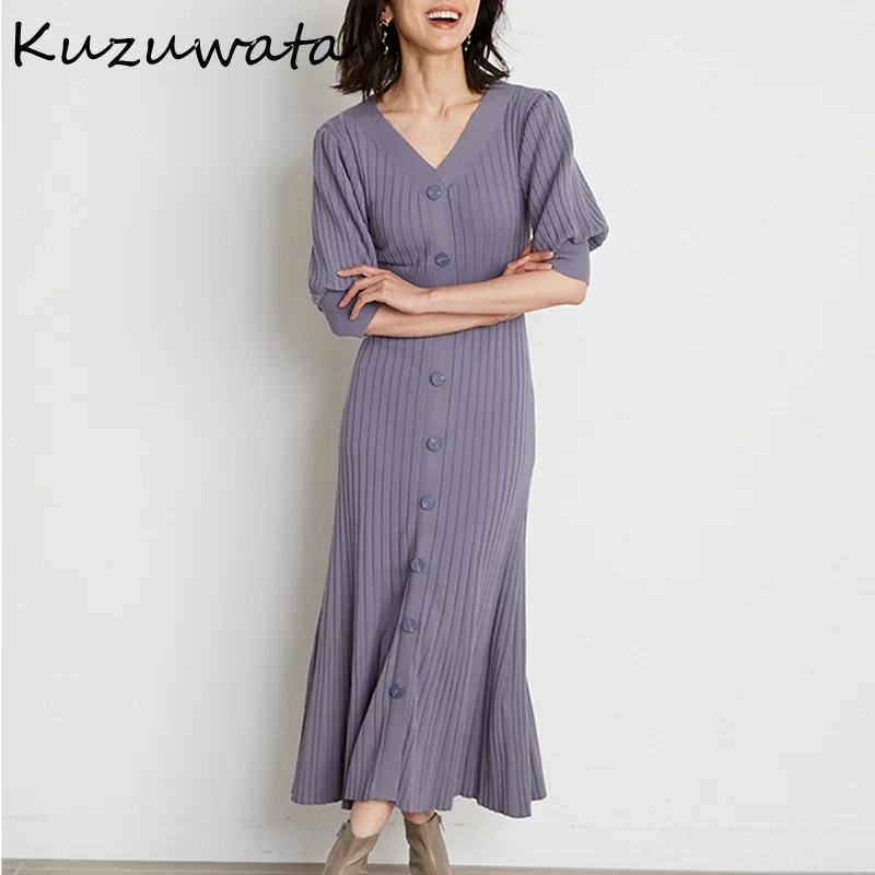 Женское трикотажное платье-Русалка Kuzuwata, однотонное трикотажное облегающее платье с V-образным вырезом и пышными рукавами, в японском стиле, осень 2022