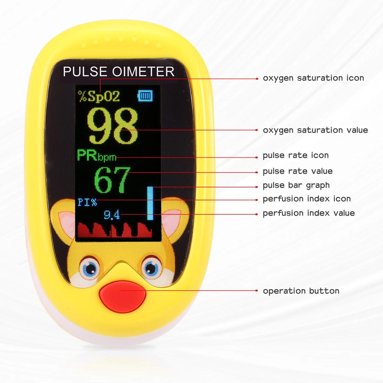 Оксиметр можно использовать для измерения насыщения кислородом, частоты пульса и перфузии через палец. Это специально разработано для детей, мини и мило.Особенности:[Многофункциональный]: пульсоксиметр в основном измеряет насыщение кислородом, скорость пульса и индекс перфузии. Это специально разработано для детей, мини и мило.[Как использовать]: Включите пульсоксиметр, поместите один из пальцев в резиновое отверстие оксиметра. Затем отпустите зажим, нажмите кнопку, оксиметр перейдет в рабочее состояние. Оксиметр автоматически попадет в режим ожидания или сна через 8 секунд без пальца в нем.[Более быстрый Дисплей: оксиметр использует передовые технологии зондирования, результаты тестирования будут отображаться на экране после 5s. Не нужно ждать.[TFT дисплей]: низкое энергопотребление, TFT четкий дисплей, 4 направления можно отрегулировать для удобного чтения. Удобный и компактный, портативный для использования дома или в путешествиях.[Гарантия]: если есть какие-либо проблемы, пожалуйста, свяжитесь с нашим магазином вовремя. Мы дадим вам удовлетворительное решение.Технические характеристики:Товар: Пульсоксиметр для детейТип дисплея: TFT дисплейЦвет на выбор: желтый, синий, красныйДиапазон измерения SpO2: 70%-99% (разрешение 1%)Точность SpO2: ± 2% на сцене 80%-99%, ± 3% на сцене 70%-79%, не имеет значения на сцене ниже 70%Диапазон измерения PR: 30BPM-240BPMТочность PR: 1 уд/минАккумулятор: 3,7 в 200 мАчОсновной Материал: АБС-пластикРезультаты тестирования: 5SАвтоматическое отключение: 8 сРазмер изделия: 4,6*2,8*2,7 смРазмер упаковки: 7,6*5,5*3,7 смВес упаковки: 29 гПримечание:* Не используйте устройство, если оно влажное или влажное из-за конденсации или разлива. Избегайте использования оборудования сразу после его перемещения из холодной среды в теплое влажное место.* Лак для ногтей или поддельные ногти могут привести к неточным показаниям spo2.* Размеры SpO2 могут быть отрицательным образом изменены при высоком освещении окружающей среды. Закройте область датчика от прямых солнечных лучей (например, полотенцем) при необходимости.* Возможны некоторые отклонения из-за ручного измерения или небольшой разницы в цвете из-за условий фотографирования. Спасибо за понимание.Упаковочный лист:1 * Детский пальцевой Пульсоксиметр1 * ремешок1 * Руководство пользователя (на английском языке)