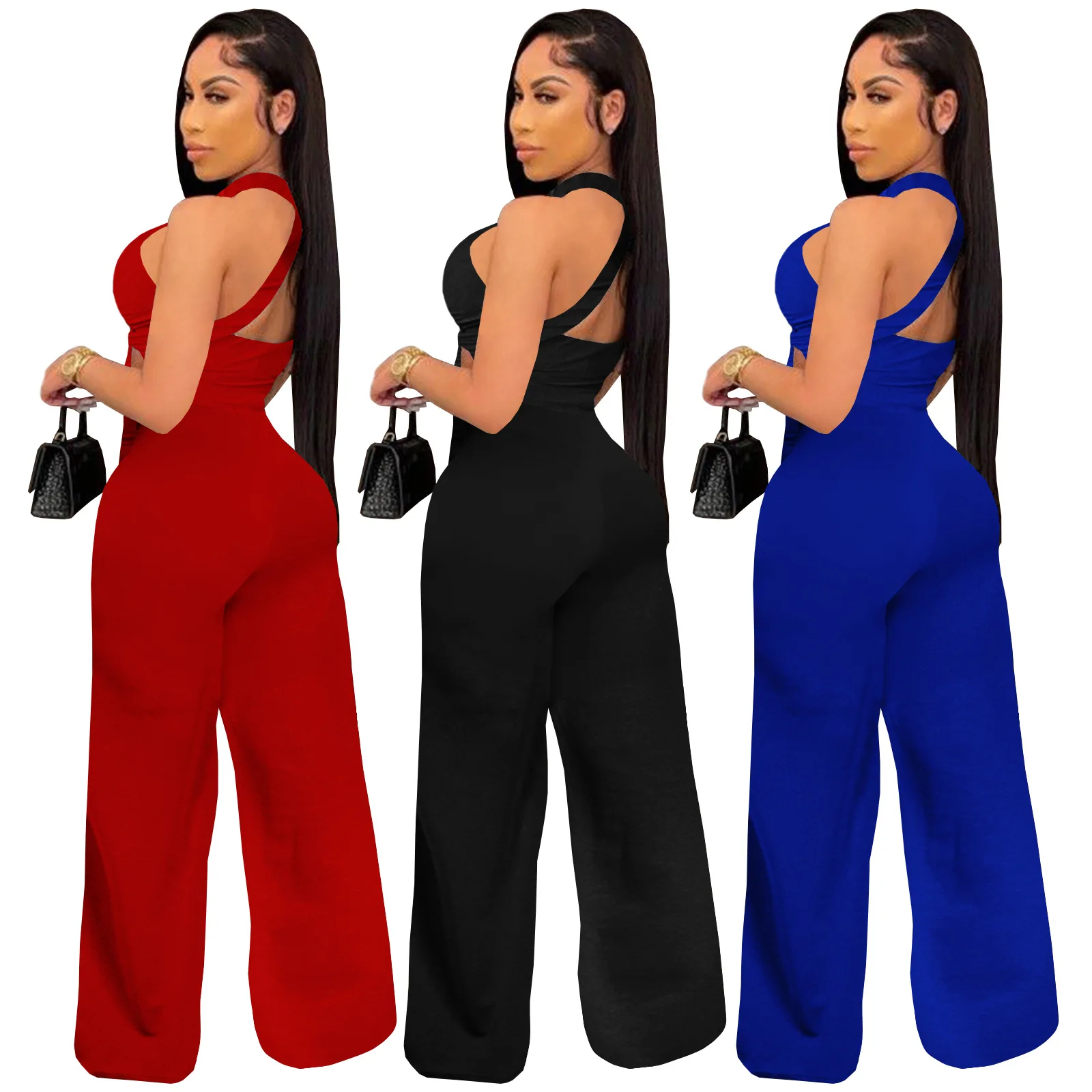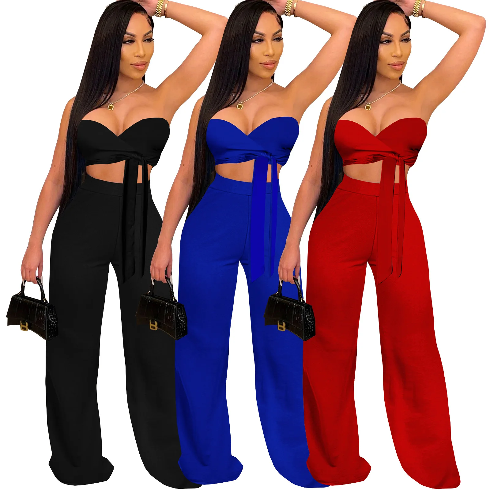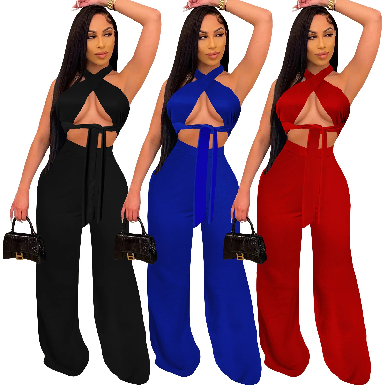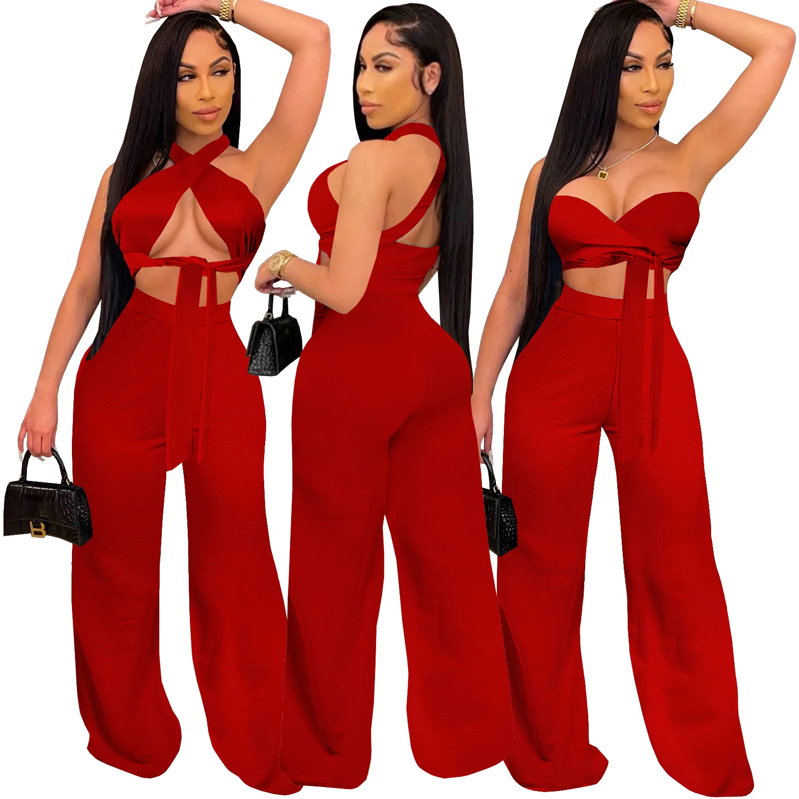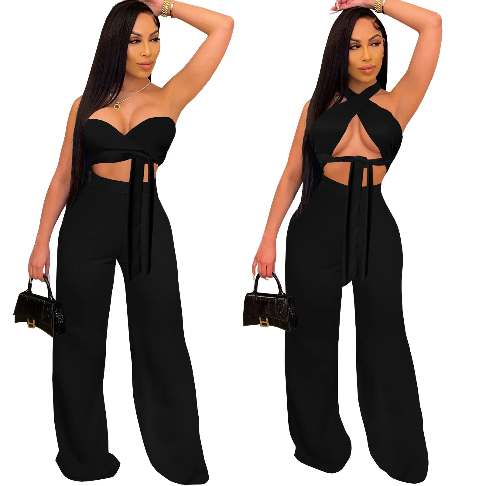 Новинка Лето 2021 стильная женская одежда VICTORIA DORA из двух предметов однотонный Повседневный брючный костюм с лямкой на шее и широкими штанинами уличная одежда