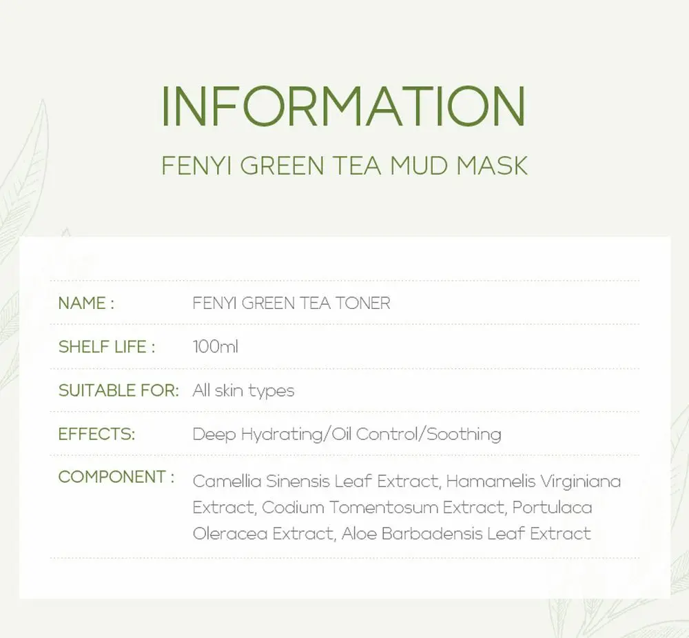 Название: тонер для зеленого чаяСрок годности: 100 млПодходит для: всех типов кожиЭффекты: глубокое увлажнение/контроль жирности/успокаивающий компонент: экстракт листьев камелии Sinensis, экстракт хамамелиса виргинской, экстракт кодиевого томентоума, экстракт олецеи портулаки, экстракт листьев алоэ барбаденсиса
