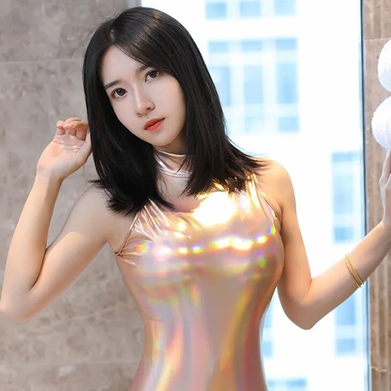 Боди женское эластичное блестящее с открытой спиной, из ткани с лазерным покрытием, эротическое нижнее белье, костюмы для косплея, металлические, из полиуретановой кожи