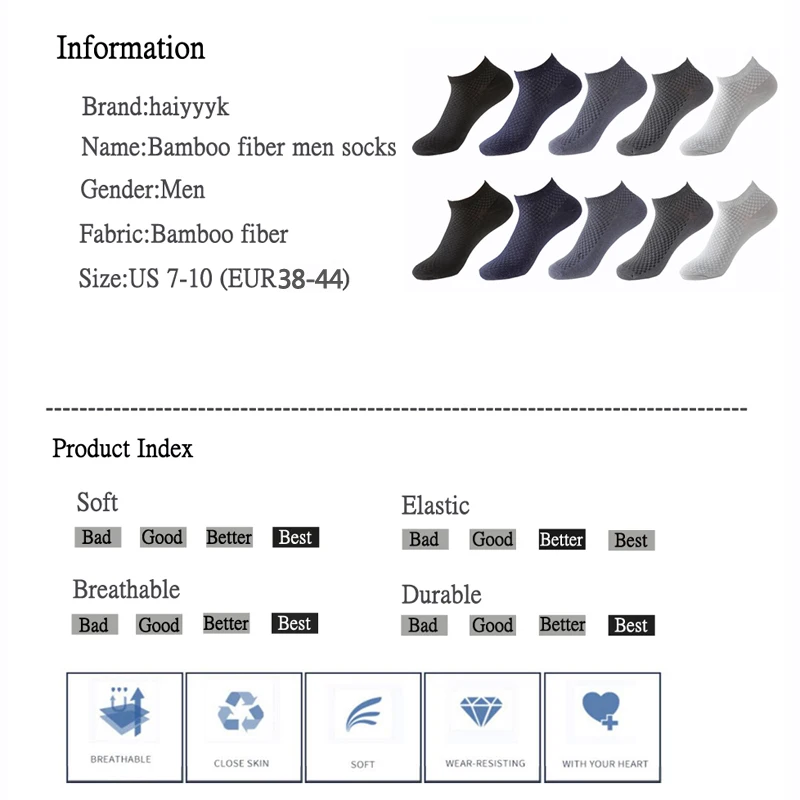 Цвет: черный, темно-синий, светильник-серый, темно-серый, серо-синий.Подходит для размера ноги: 38-44 евро (6-10 США)Состав ткани: 80% бамбук, 10% спандекс, 10% акрилХарактеристики ткани: мягкая и удобнаяАдаптация к сезону: четыре сезонаУпаковка: упаковано в пластиковый пакетМесто происхождения: КитайПосылка ция: 10 пар