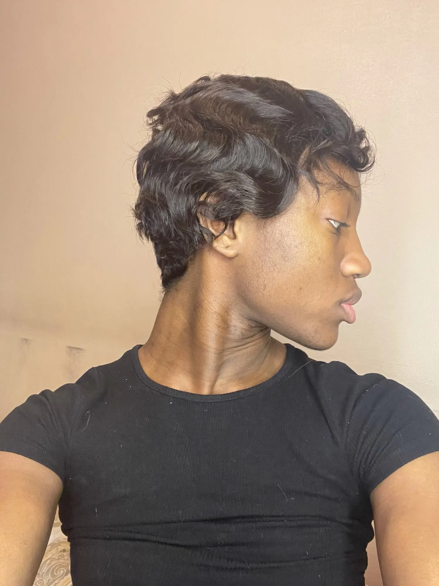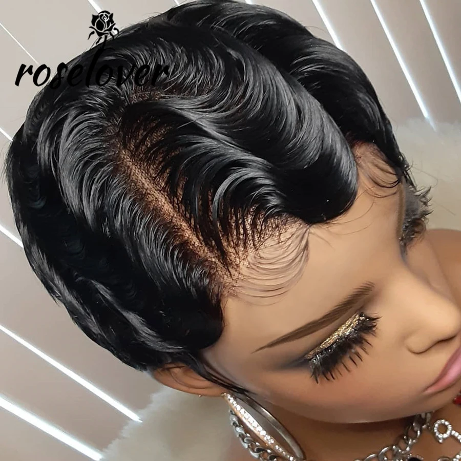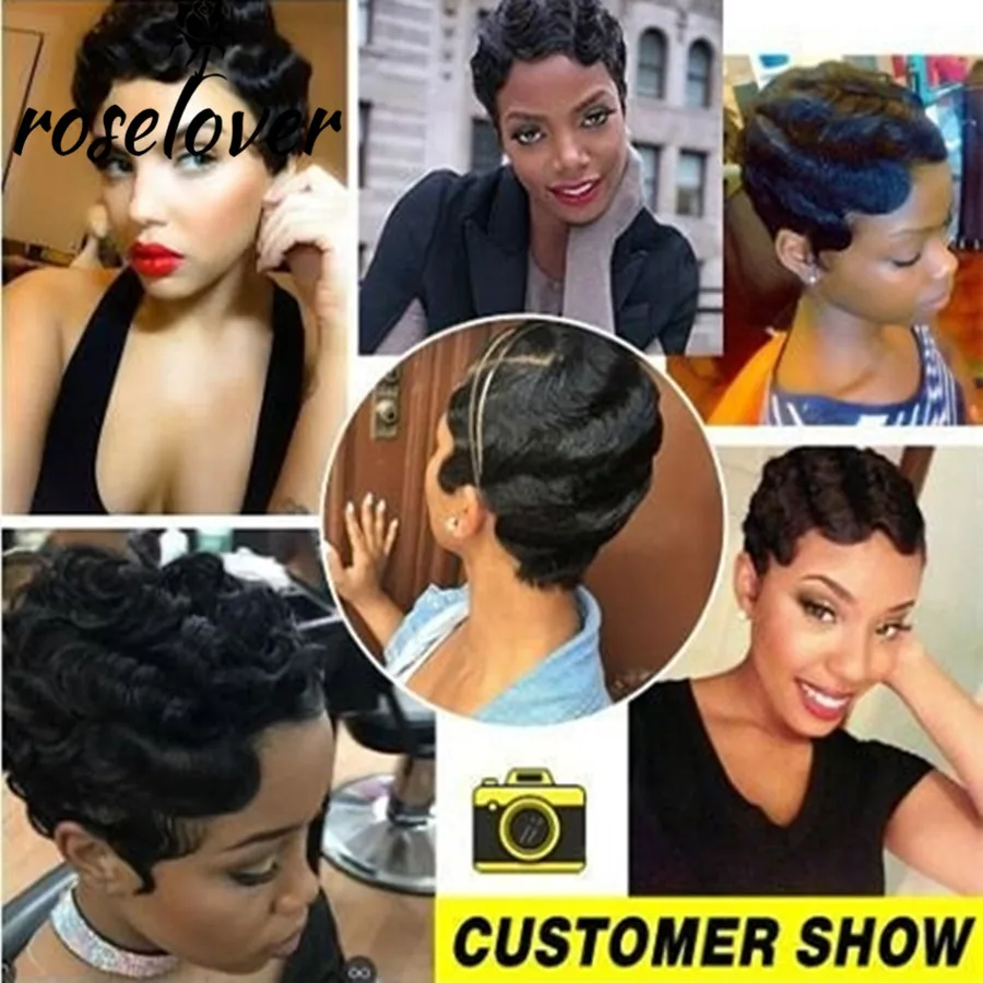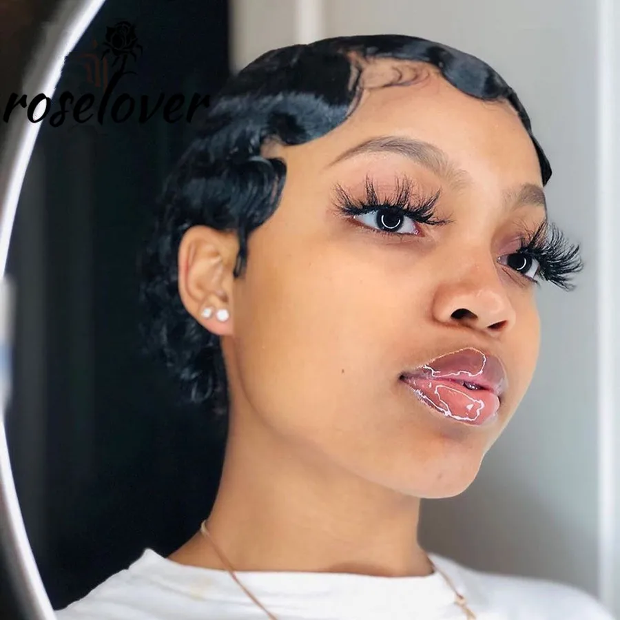 Бразильские короткие человеческие волосы с вырезом Пикси, парики с волнами на палец, прически для черных женщин, милые дешевые парики Remy, полностью машинные парики