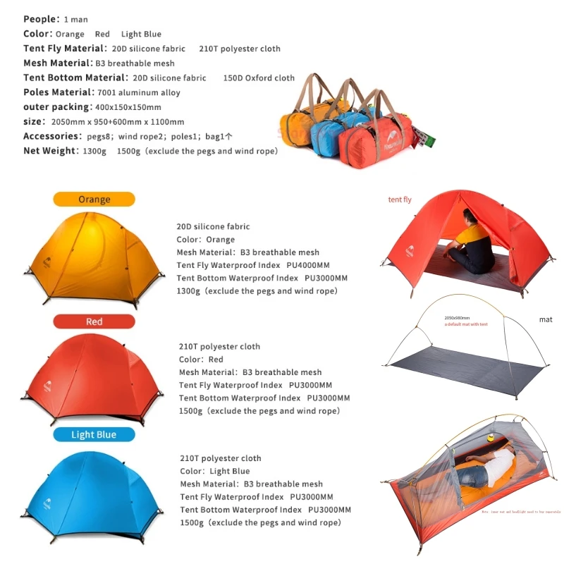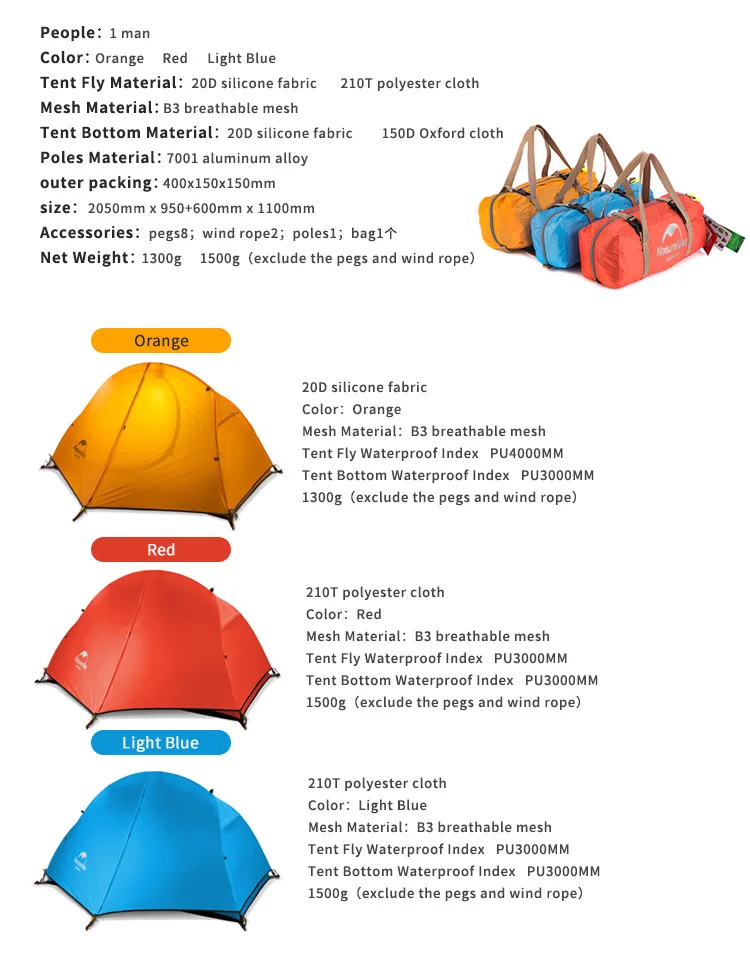 Описание товара:Бренд: NaturehikeНазвание: Сверхлегкая палатка для кемпингаЦвет: оранжевый/красный/синийВнешняя палатка: 20D 380T нейлоновая клетка + Dunable застежкаВнутренняя палатка: 210T непромокаемая полиэфирная ткань + сетка B3Материал подошвы: 150D Непромокаемая ткань Оксфорд в клеткуШатер: 7001 алюминиевый сплавРазмер упаковки: 400*150*150 ммРазмер: 2050*950 + 600 мм * 1100 ммАксессуары: наземный гвоздь * 8, винная веревка * 2,Алюминиевый столб * 1, упаковка * 1
