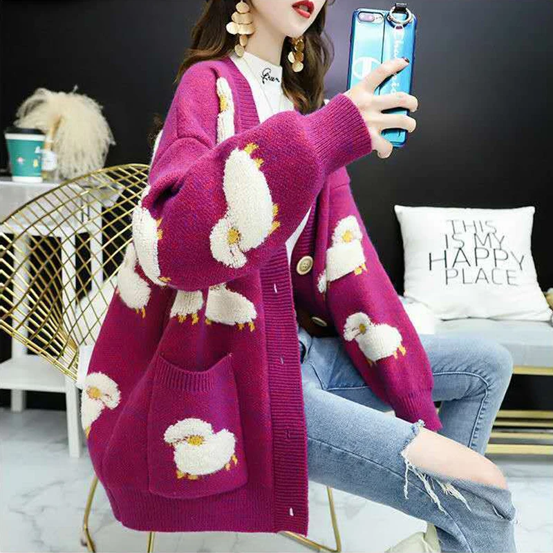 Осенне-зимний вязаный женский кардиган, свободный уличная одежда, вязаный свитер, пальто, милый мультяшный принт, v-образный вырез, вязаный кардиган, Женская куртка