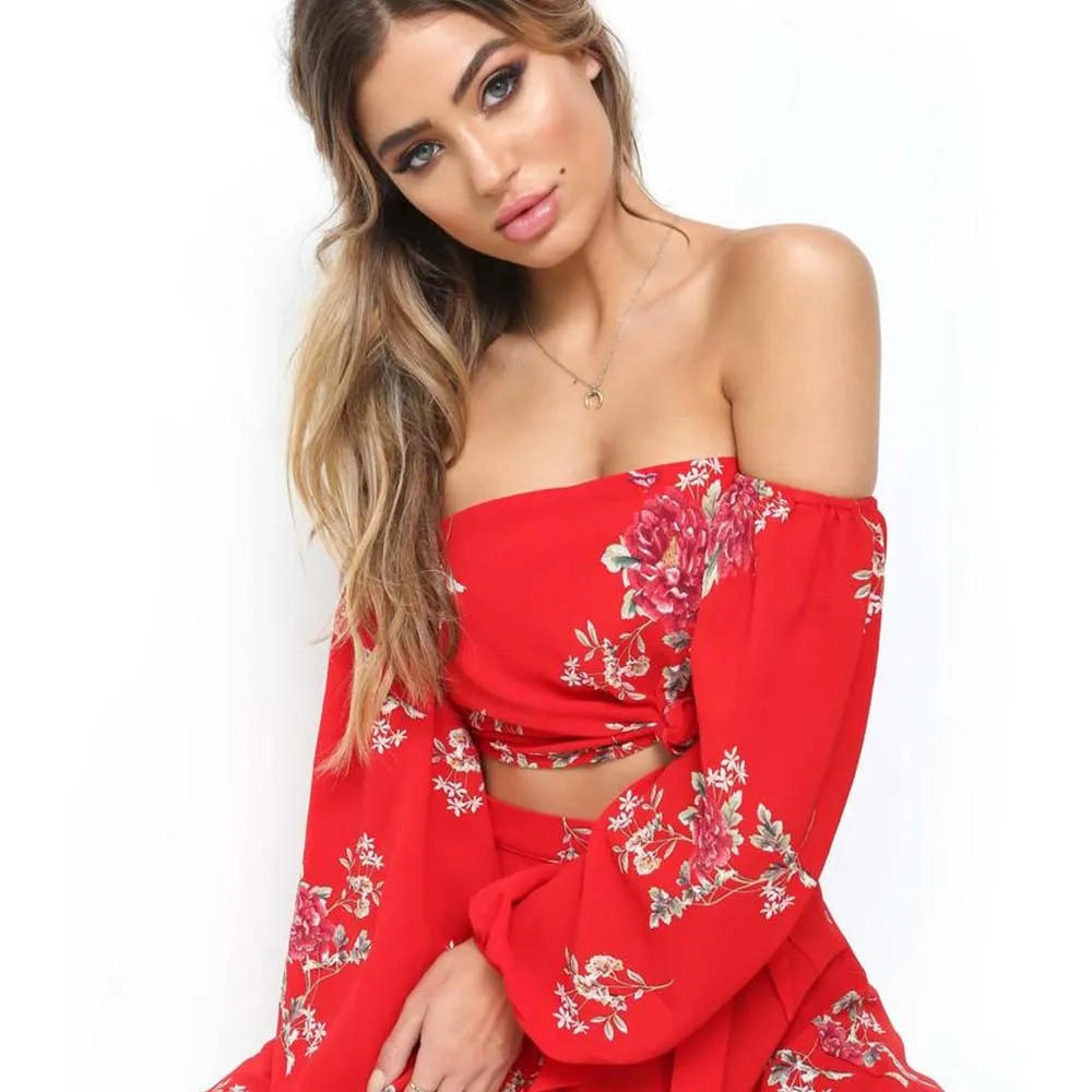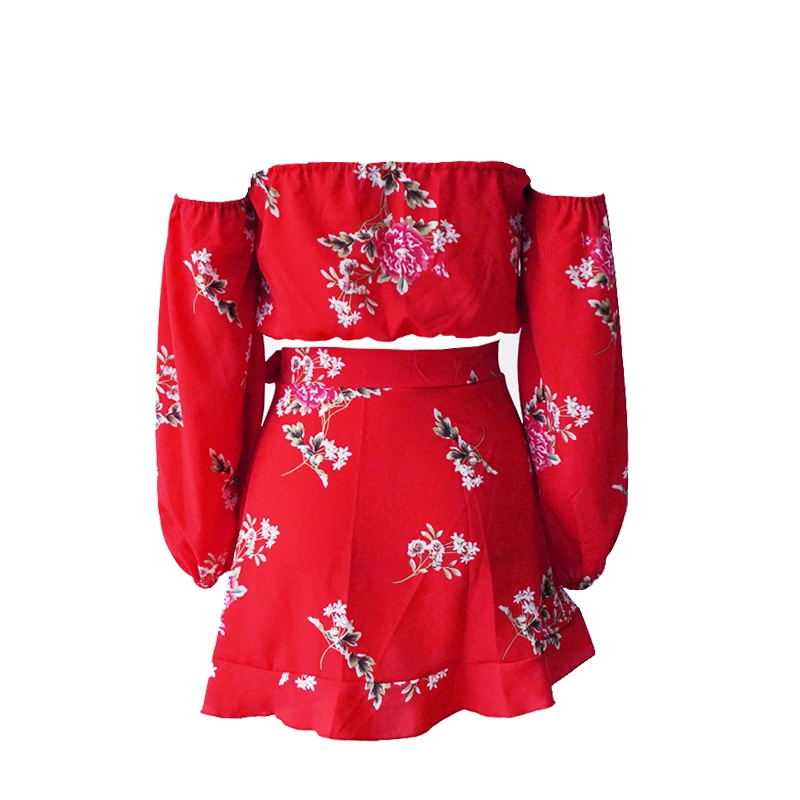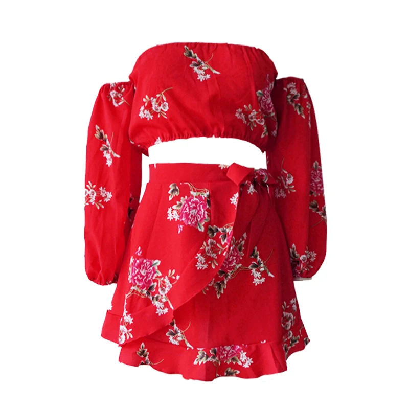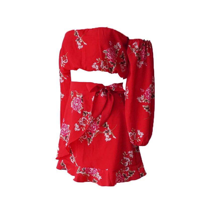 Летние модные женские красные пляжные платья на одно плечо, бандажный короткий топ с цветочным принтом, короткая юбка, наряд, сарафан, комплект из двух предметов