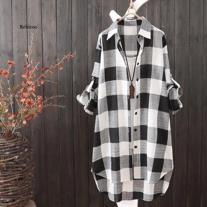 Женские рубашки в клетку, весна 2022, асимметричные блузки с длинны...