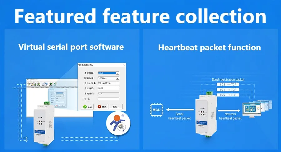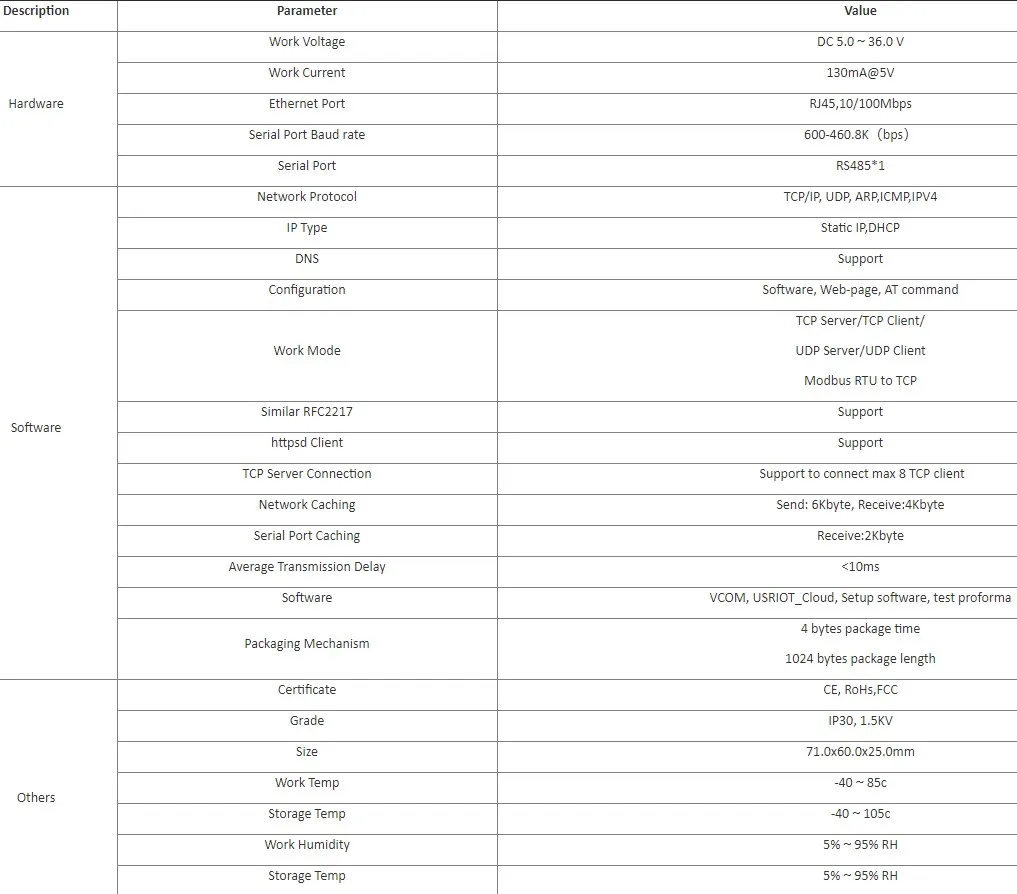 ????Простая конфигурация и простота в использовании????Компактный, легкий????Поддерживает TCP сервер/клиент, UDP сервер/клиент, виртуальный COM????Порт RS485, промышленный класс????Стандартный DIN-рейке????Modbus RTU в Modbus TCP????Один RS485 Преобразователь ethernet, RS485 к tcp ip широко используется в промышленной автоматизации.