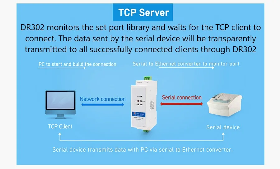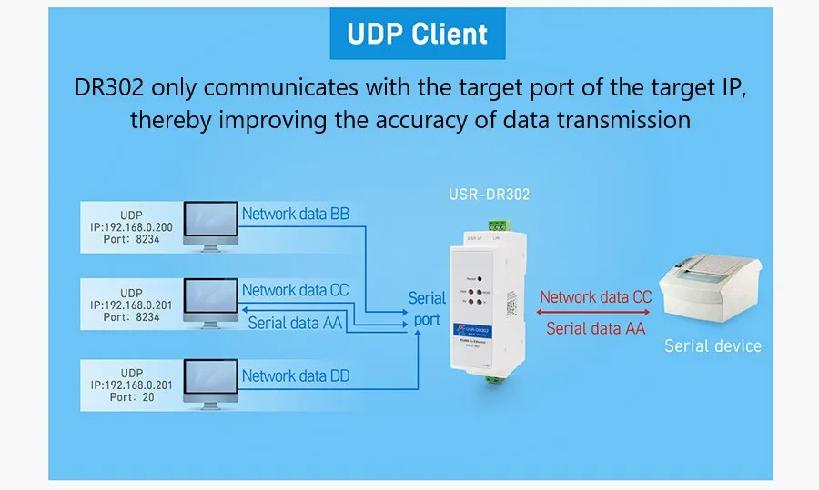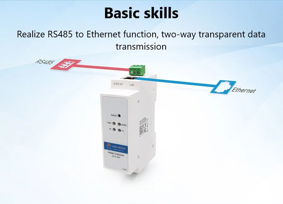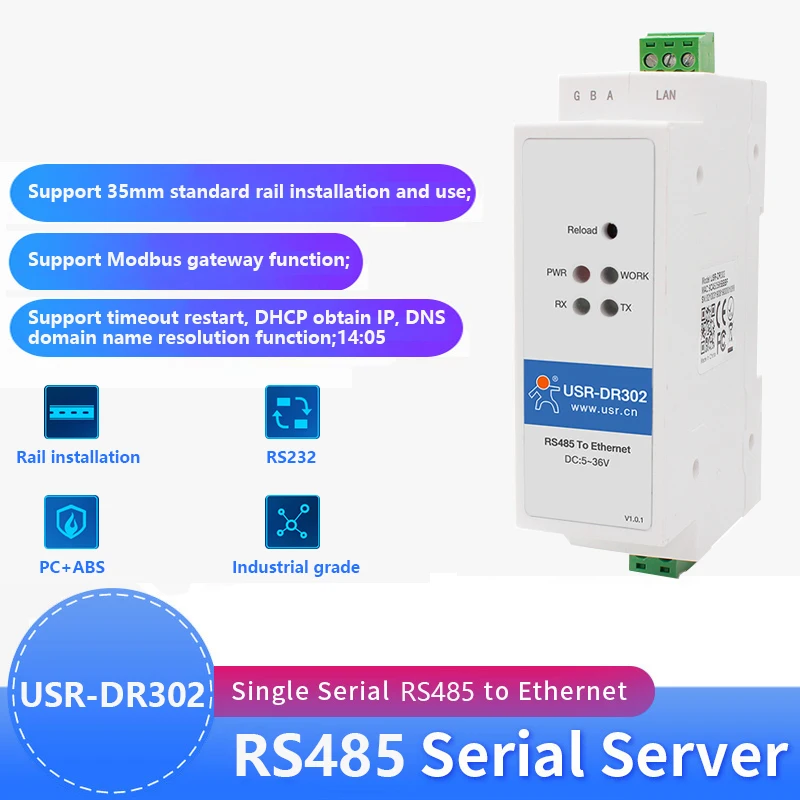 Din-рейка RS485 преобразователь Ethernet USR-DR302 может передавать данные прозрачно между TCP/IP и RS485, которые широко используются в промышленной автоматизации. USR-DR302 представляет собой din-рейку RS485 в Ethernet конвертер, который может передавать данные прозрачно между TCP/IP и RS485. Через веб-страницу или программное обеспечение, rs485 к Ethernet конвертер может реализовать последовательные данные и TCP/IP посылка данных прозрачной передачи.